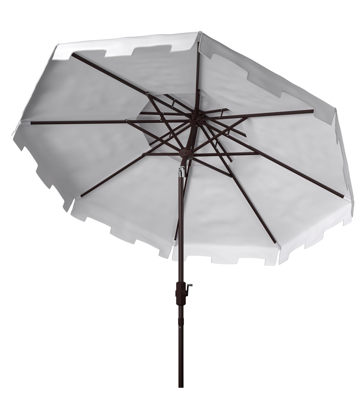 A classic market umbrella gets a stylish makeover in tonal white hues with a double top for chic European flair. Its nine foot polyester canopy and brown aluminum post make it ideal for the veranda or pool deck. Includes easy crank and tilt mechanism.