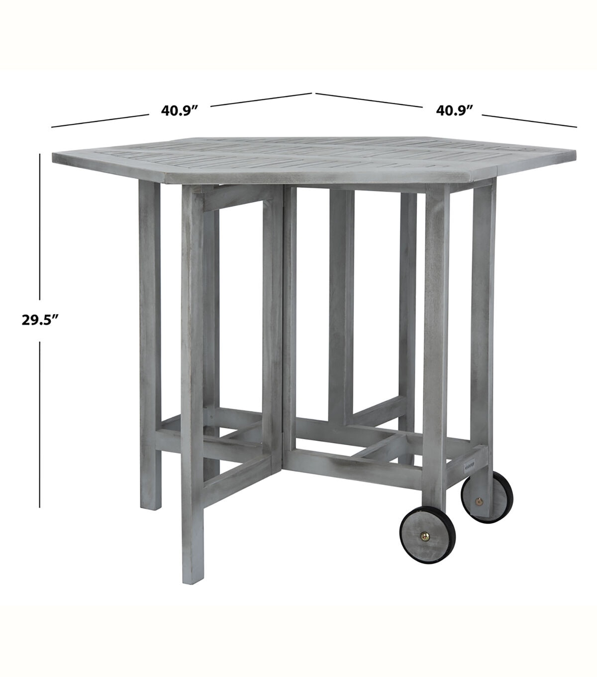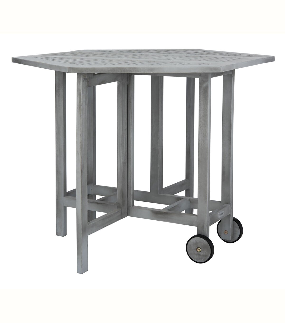 Stack the odds for carefree outdoor living in your favor with the ingenious Kerman dining table and chair set. Crafted of eco friendly Gray washed acacia wood, 4 director style chairs fold and tuck under a foldable hexagonal table for easy storage.