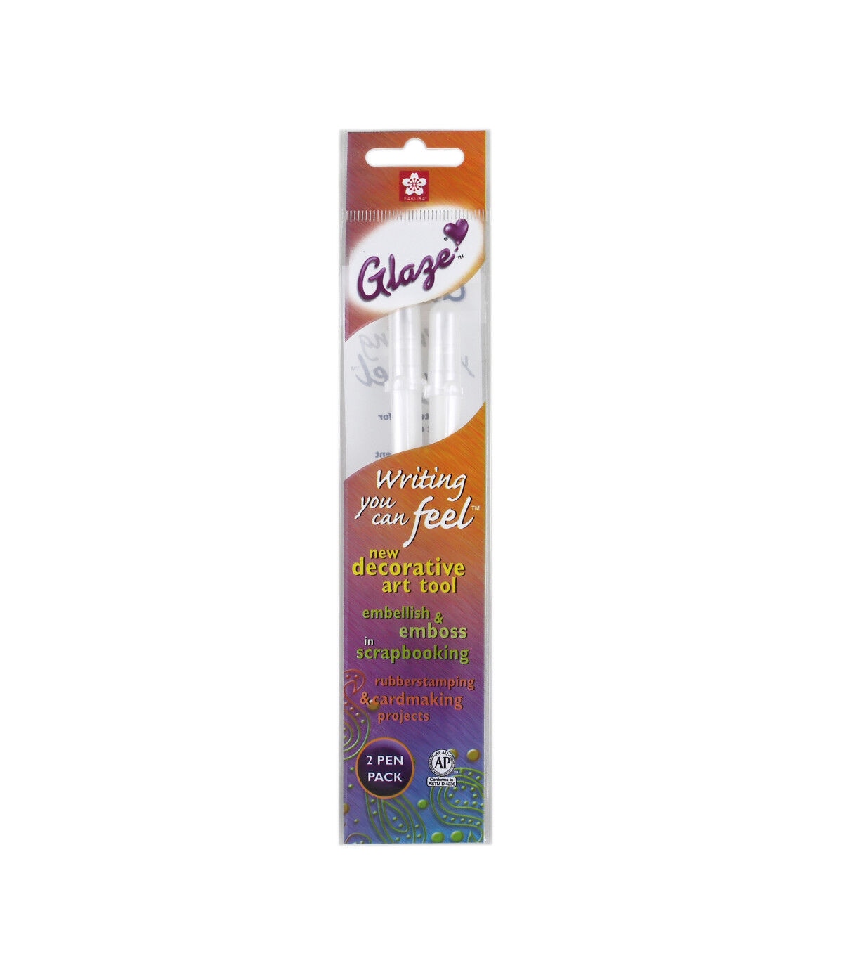 Glaze is a decorative art pen with raised writing you can feel! Glaze writes well on plastic and non-porous surfaces. Decorate and customize invitations, cards, CDs, vellum and plastic surfaces - they can also be used for rubber stamp embellishments, eliminating the need for powders and heat tools. For a beautiful stained glass effect, use on translucent and transparent surfaces and hang in the window. Glaze ink also resists water and can achieve the look of batik. Make secret messages by writing with clear, then sponge on color to reveal the writing or drawing.