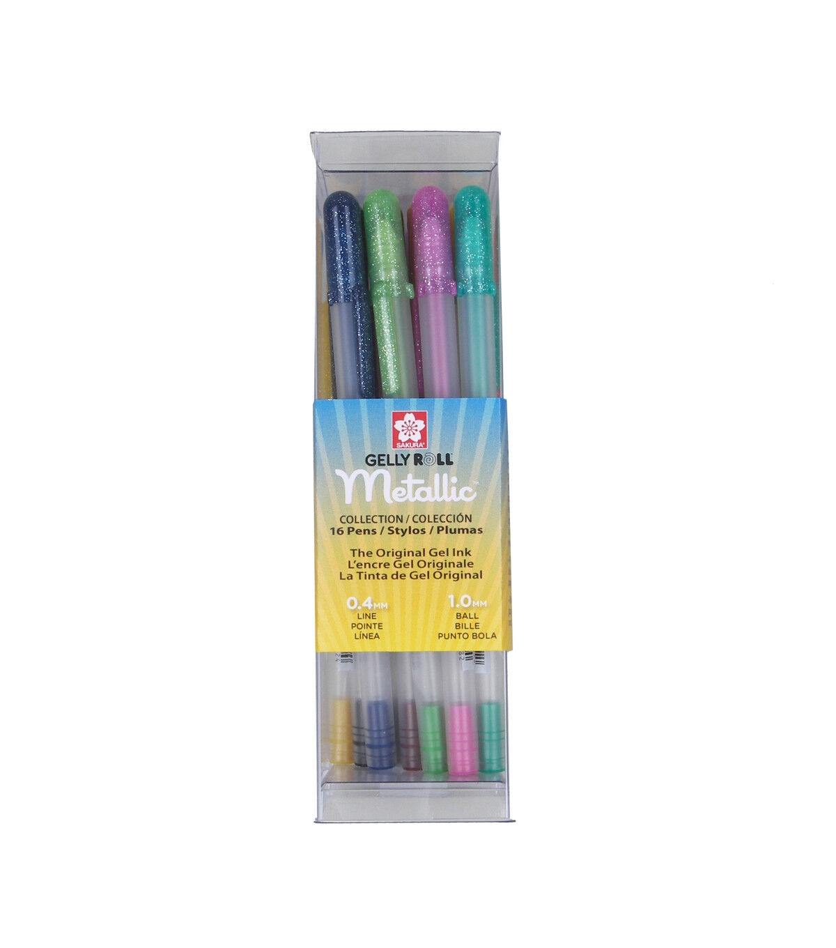 This collection features Sakura favorites - Gelly Roll Metallics in a range of vibrant colors, all snugly nestled in a re-usable, durable, clear plastic container that keeps the pens organized, allows for easy transport and makes for easy color and style identification. Great for students, artists, scrapbookers, crafters, and more. This set contains two each gold and silver, and one each of red, pink, purple, emerald green, blue, sepia, burgundy, hunter green, blue/black, black and copper.