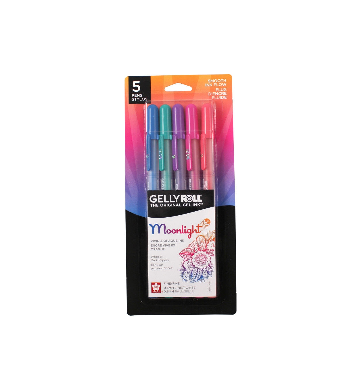 Gelly Roll Moonlight Pens shed light onto art works, school projects, memos and more. The ultra vivid, opaque inks are luminous on light or dark paper and on most porous surfaces. These fluorescent colors glow under a black light for added effect; this set includes Red, Rose, Purple, Green and Blue.