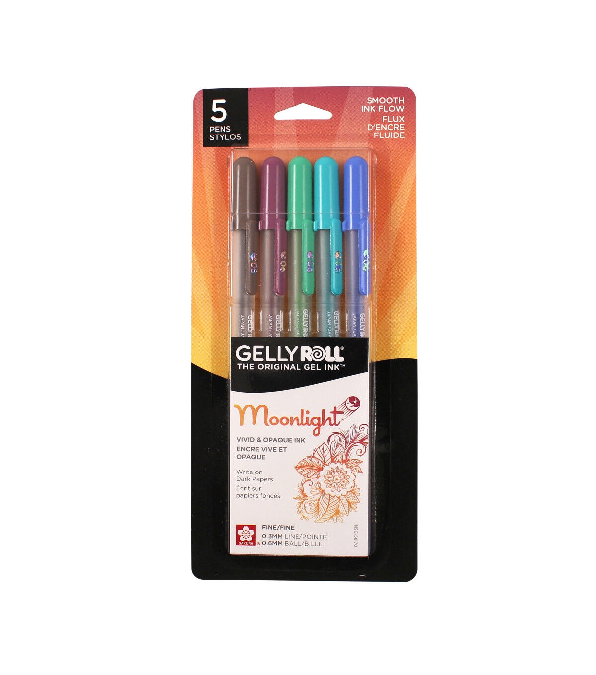 Gelly Roll Moonlight Pens shed light onto art works, school projects, memos and more. The ultra vivid, opaque inks are luminous on light or dark paper and on most porous surfaces. The ink flows through a medium or fine-nib rollerball with creamy smooth consistency resulting in extraordinary writing comfort. This set includes Van Dyke Brown, Bordeaux, Leaf Free, Blue Green and Ultramarine.