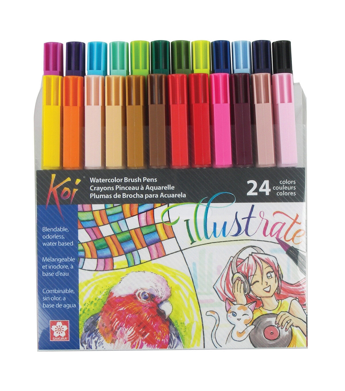 These pens perform similarly to paint brushes; they are ideal for drawing, coloring, customizing and lettering. Change the brush stroke thickness by altering the amount of pressure you apply while using, and the nib automatically springs back to its original shape for easy coloring. Experiment with creating unique colors with two or more pens. This set includes yellow, orange, pale orange, woody brown, dark brown, brown, vermilion, red, pink, burgundy, fuchsia, lilac, iris, purple, sky blue, peacock green, yellow green, green, sap green, fresh green, blue, light sky blue, Prussian blue and black.