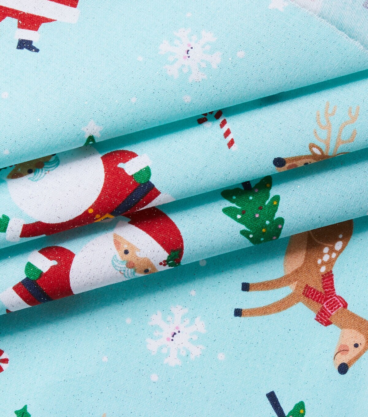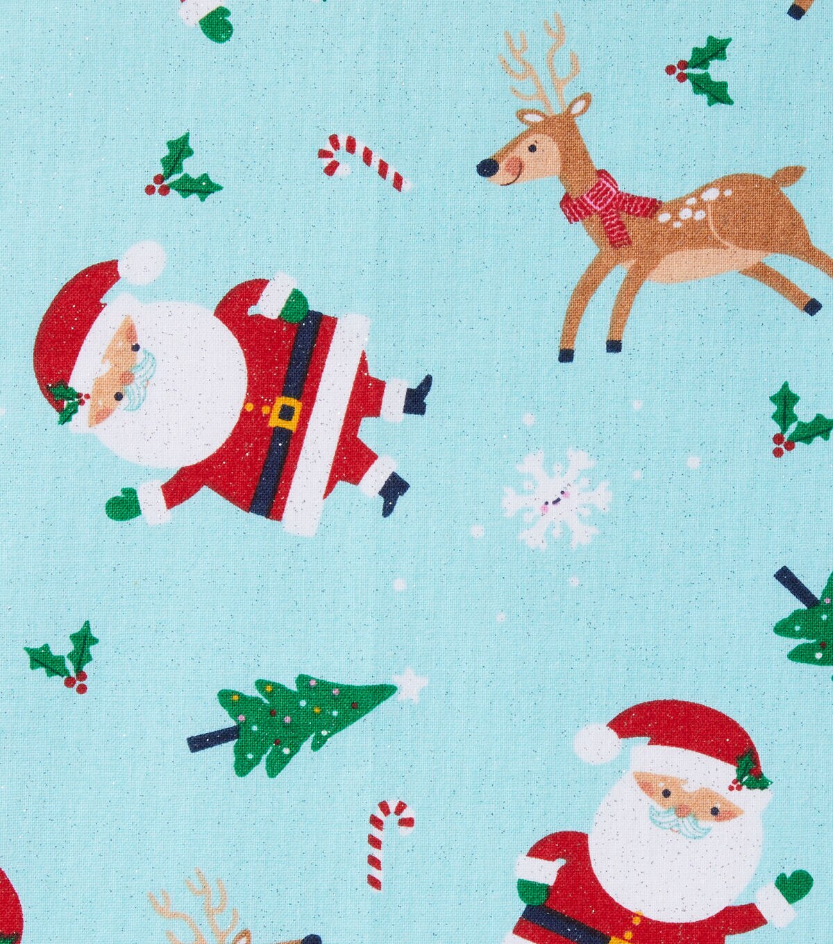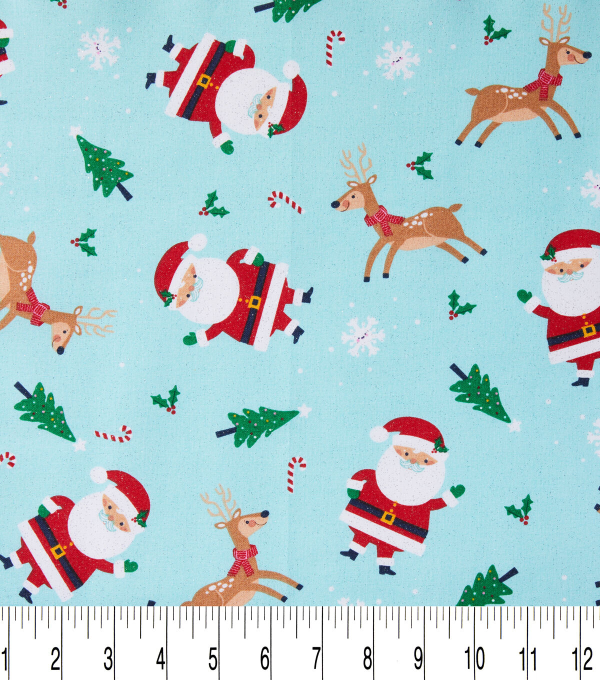 Get into the Holiday Spirit with Santa Claus & Reindeer on Blue Christmas Glitter Cotton Fabric
