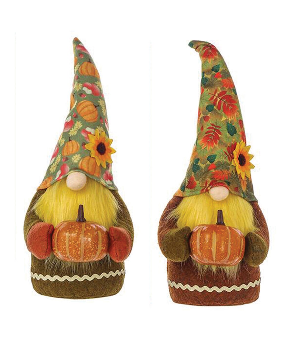 Gnomes work hard all year in their gardens planting, weeding and watering, so when autumn finally comes around they are excited to see their results! These two gnomes, holding the little pumpkins they grew, are dressed for the occasion with fall-themed pointy hats, sunflower pins and earth-toned clothes and mittens. Soft and snuggly, this wonderful set of two 13.5" Fall Harvest Gnomes is sure to provide many seasons of pleasure.