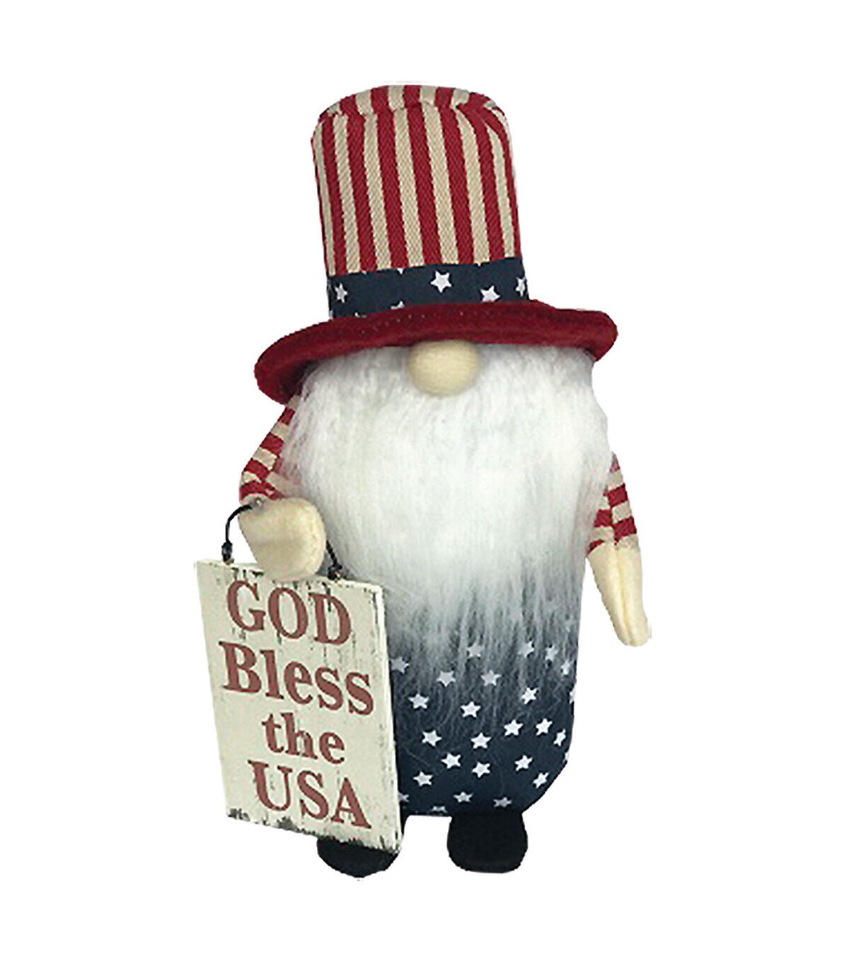 Wearing an American flag themed hat and carrying a sign that reads "GOD Bless the USA," this handsome gnome is a true patriot of the United States of America. Soft and cuddly, this gnome is comfortable cradled in your arms or sitting alone on a mantle or windowsill. The detail and craftmanship of this wonderful 14" Americana Gnome will bring fun and delight for many seasons to come.