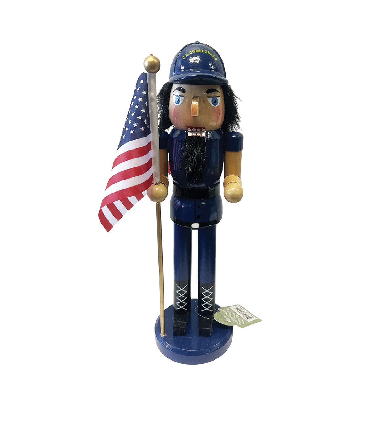 Standing tall and proud as one of America’s finest, this Coast Guard nutcracker is a holiday hero and serves as an homage to those who faithfully and selflessly give their service. Wearing the dress blues uniform and carrying the American flag, this warrior is ready to defend our country's coastal waters. Beautifully handcrafted from wood and hand painted, this patriotic 14" Coast Guard with Flag Nutcracker is sure to provide many seasons of pleasure.