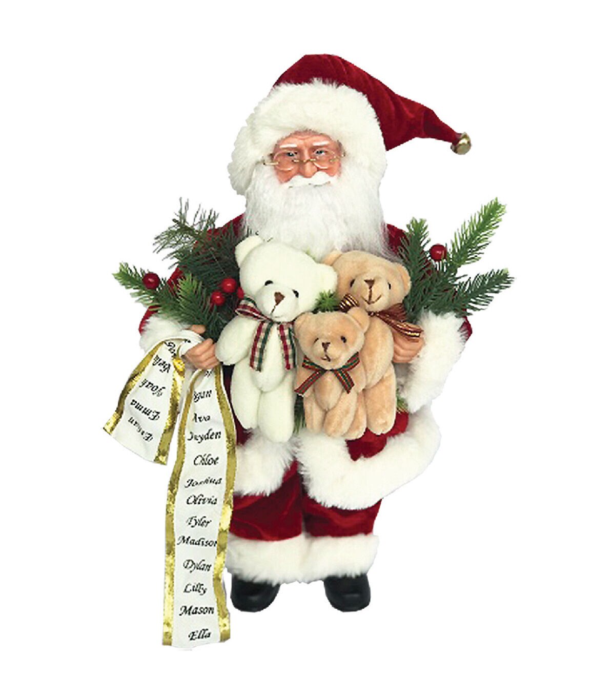 It's always a time of great excitement when the first holiday decorations are hung and the Christmas season has officially begun. Santa wants to make sure all the good girls and boys get everything they asked for this year, so he's checking his wish list once again! Dressed in his traditional red outfit with matching hat, Santa is carrying a fresh pine garland and holds three of the plush teddy bears that will soon make three children's Christmas wishes come true. With head, hands and boots molded from sturdy resin, this wonderful 15" Bear Hug Claus will bring fun and delight for many seasons to come.