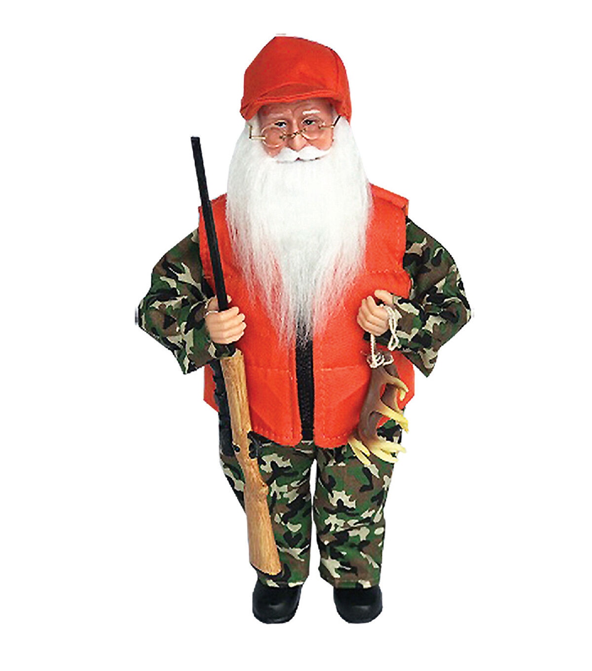 When hunting season starts, Santa switches his hat and vest from Christmas red to hunter orange! Wearing green camouflage under his orange vest, Santa carries his trusty hunting rifle and a pair of deer antlers. With head, hands and boots molded from sturdy resin, this 15" Deer Hunter Claus will delight for many seasons to come.