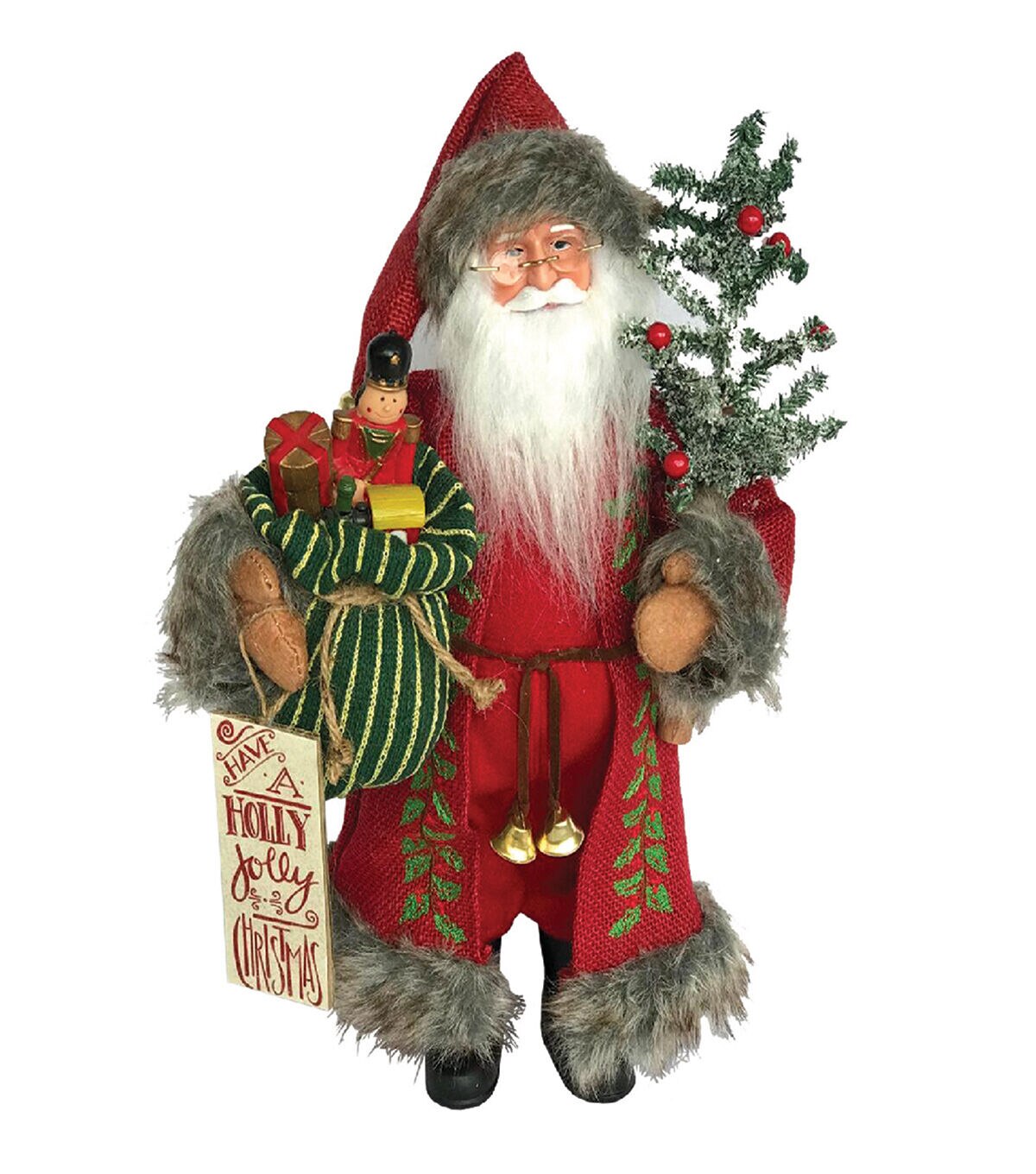 It's every child's dream as they drift off to sleep on Christmas Eve . . . waking up to see Santa Claus carrying an armload of presents to place under their Christmas tree! Wearing a heavy faux fur trimmed red jacket decorated with holly graphics and matching red hat, Santa carries a large bag of shiny new toys in one arm, and a green tree with red balls and a sign that reads "Have a Holly Jolly Christmas" in the other. The detail and craftmanship of this wonderful 15" Holly Jolly Claus will bring fun and delight for many seasons to come.