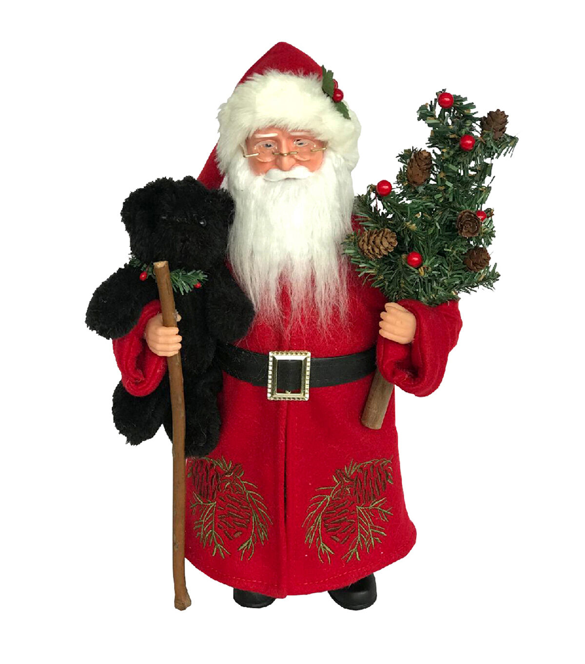 Whether spending time alone in the woods seeking quiet affirmations from his forest friends, or taking peaceful strolls through open sunlit meadows, Santa always makes time to reconnect with nature. Today, Santa is dressed in a warm red jacket with pine cone graphics and matching red hat. He holds a naturally decorated evergreen tree in one hand, a walking stick in the other hand, and a cute little black bear is nestled in his right arm. With head, hands and boots molded from sturdy resin, this wonderful 15" Pine Cone Santa and Black Bear will bring fun and delight for many seasons to come.
