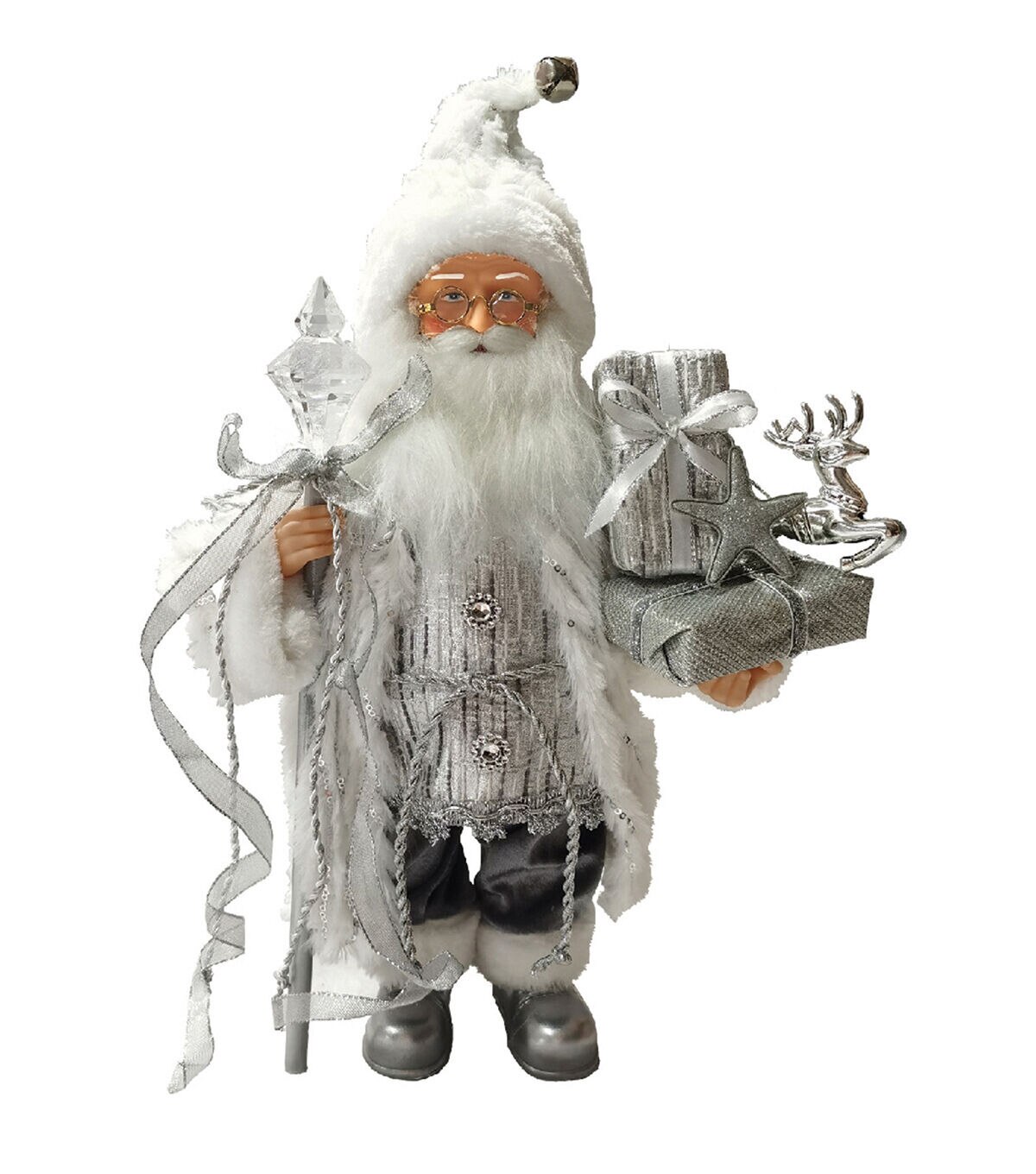 Toss out that old red suit because Santa is taking it up a notch! Santa's new look features a white faux fur jacket and hat with silver highlights, an ornate silver vest and shiny silver boots. He carries a silver staff in one arm and some stylish presents and holiday decorations in the other. With head, hands and boots molded from sturdy resin, this wonderful 15" Silver Gift Bearer Santa will bring fun and delight for many seasons to come.