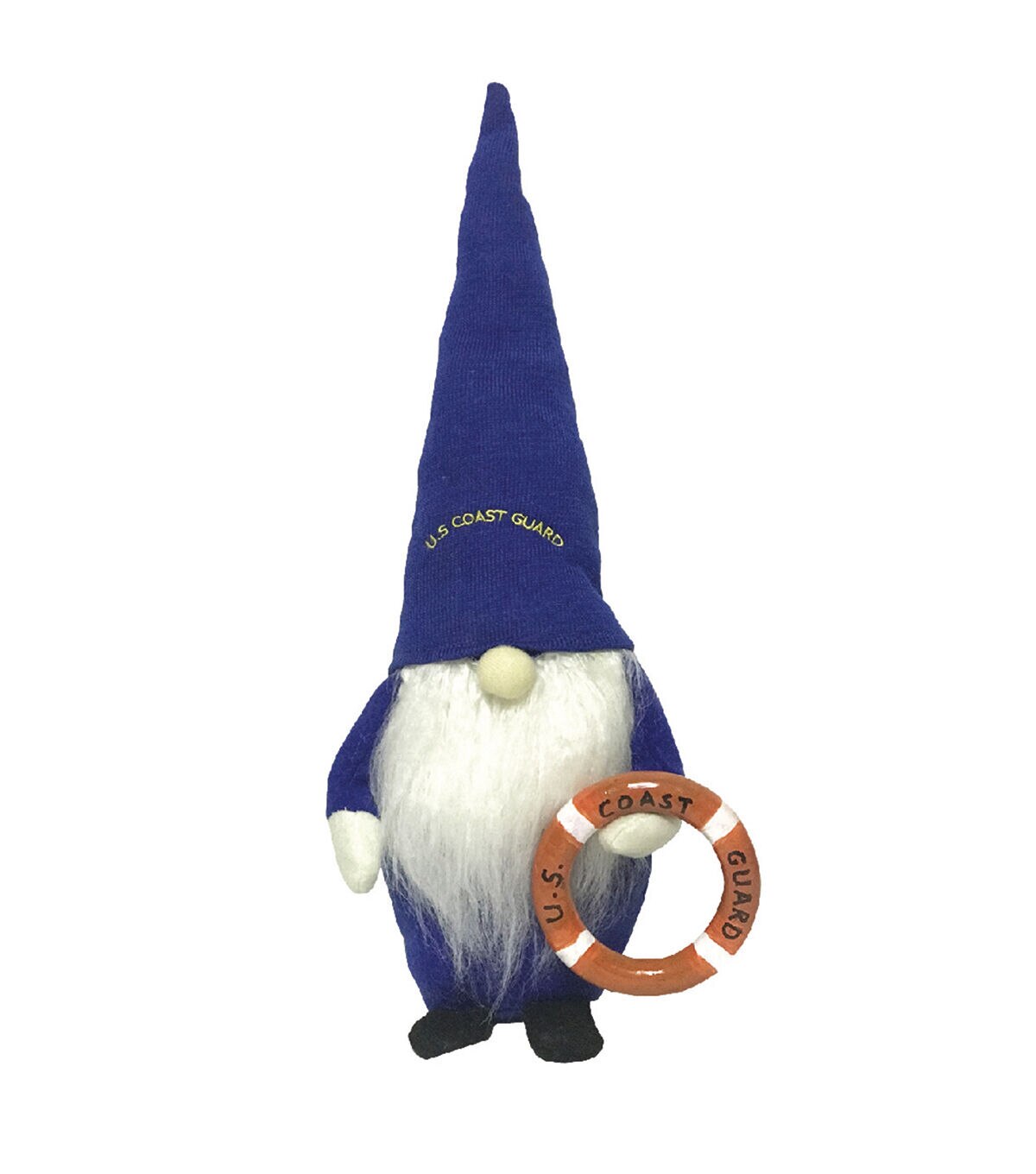 Wearing a dark blue pointy hat and carrying a life preserver that both read "U.S. Coast Guard," this handsome gnome is proud to support the men and women who protect our coastal waters. Soft and cuddly, this gnome is comfortable cradled in your arms or sitting alone on a mantle or windowsill. The detail and craftmanship of this wonderful 16" Coast Guard Gnome will bring fun and delight for many seasons to come.