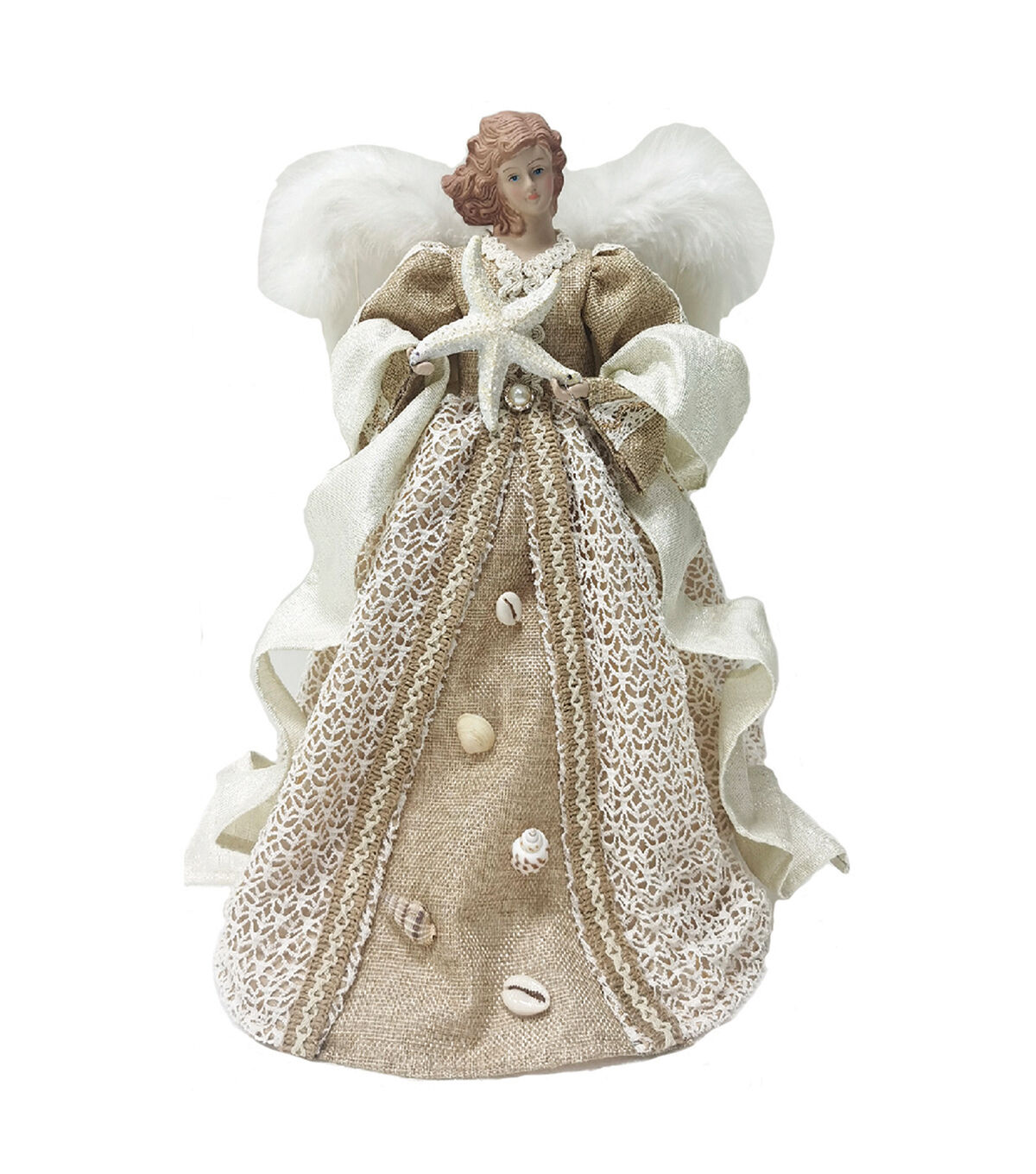 After the lights are strung and the ornaments and tinsel are hung, there's one final step to make a Christmas tree perfect: placing a beautiful decoration on the very top. This exquisitely ornate and wonderfully detailed Angel tree topper is a perfect compliment to any tree. Dressed in a shell decorated, sand-colored gown, supported by cloud-like feathery wings and holding a white starfish, this angel is a seashore inspired celebration of the holiday season. Decorate for the holidays in style with this elegantly handcrafted 16" Coastal Angel Tree Topper that is sure to provide many seasons of pleasure.