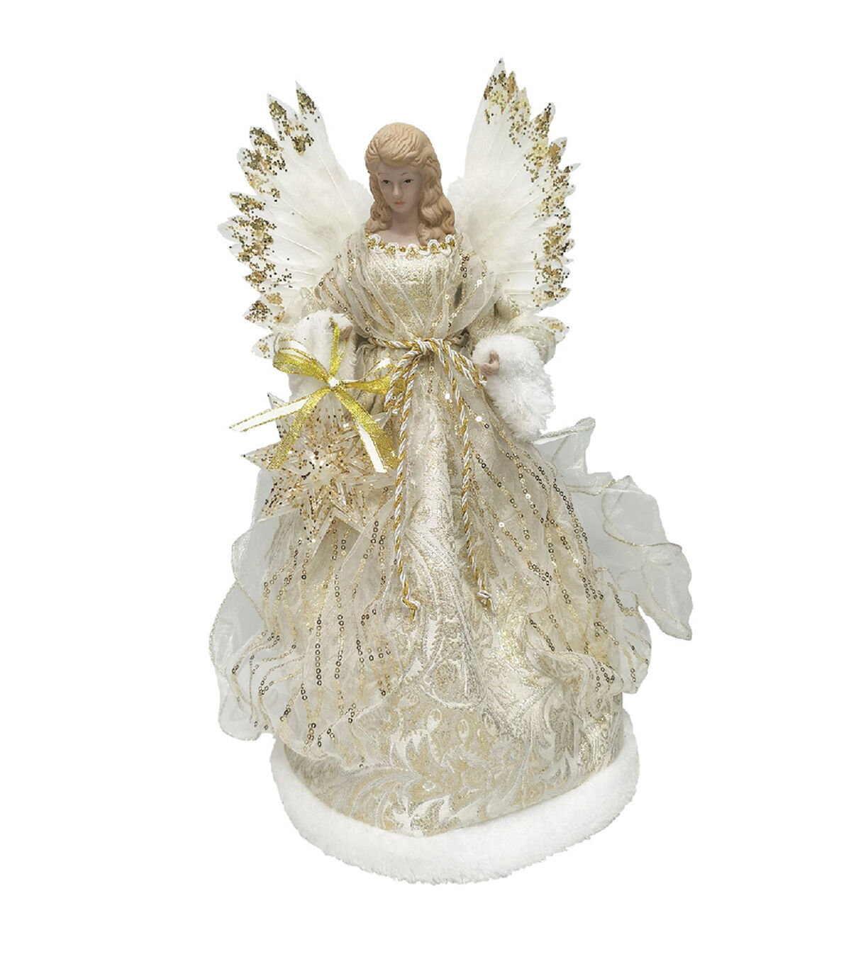 After the lights are strung and the ornaments and tinsel are hung, there's one final step to make a Christmas tree perfect: placing a beautiful decoration on the very top. This exquisitely ornate and wonderfully detailed Angel tree topper is a perfect compliment to any tree. Dressed in a faux fur trimmed glittery golden gown, supported by white feathery wings and holding a shiny Christmas star, this angel is a classic celebration of the holiday season. Decorate for the holidays in style with this elegantly handcrafted 16" Golden Angel Tree Topper that is sure to provide many seasons of pleasure.
