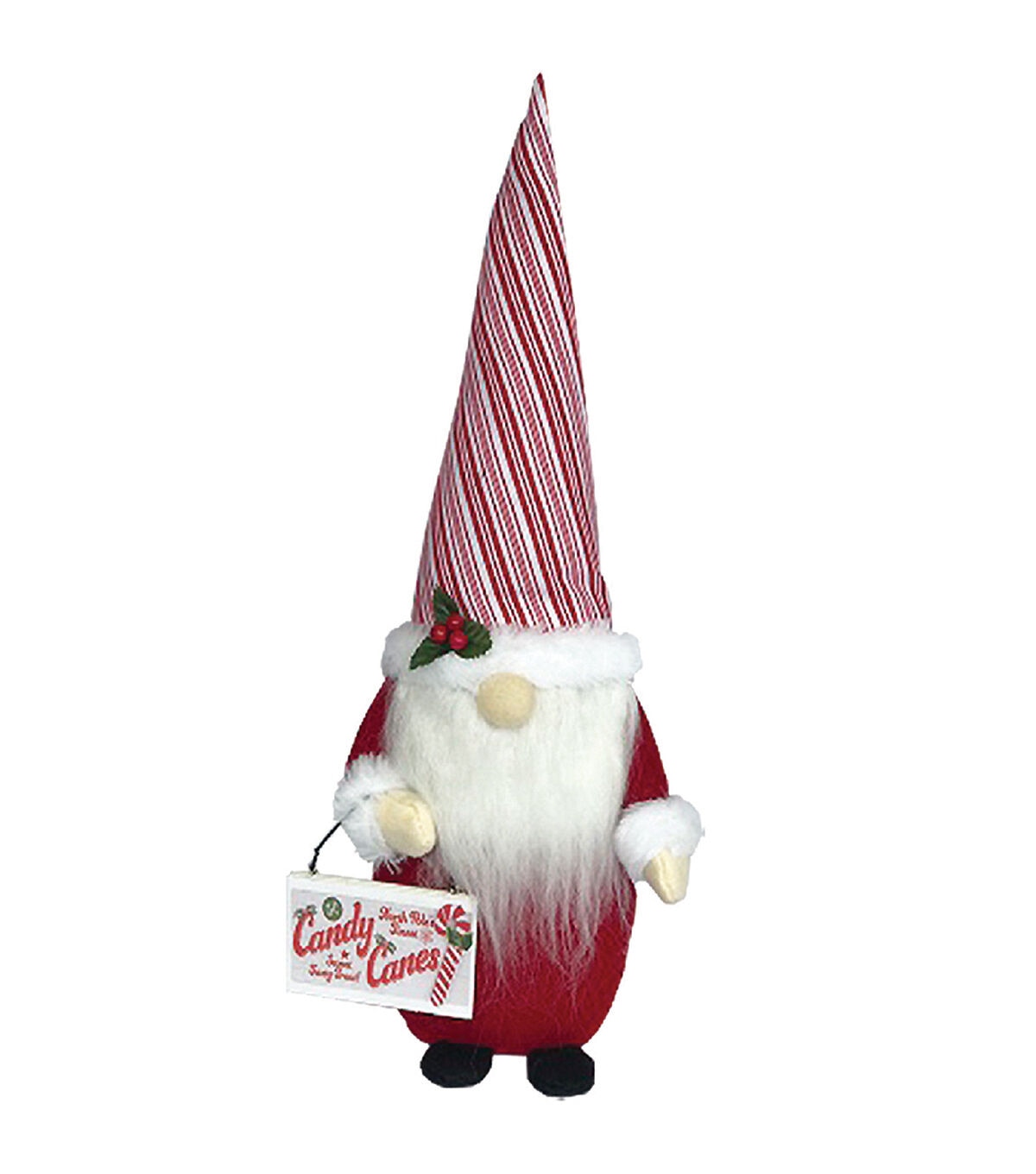 Wearing a candy striped hat and carrying a sign that reads "Candy Canes, North Pole's Finest, Sweet Tasty Treat!" this handsome gnome is a walking advertisement for Santa's favorite holiday confection. Soft and cuddly, this gnome is comfortable cradled in your arms or sitting alone on a mantle or windowsill. The detail and craftmanship of this wonderful 17" Candy Cane Gnome will bring fun and delight for many seasons to come.