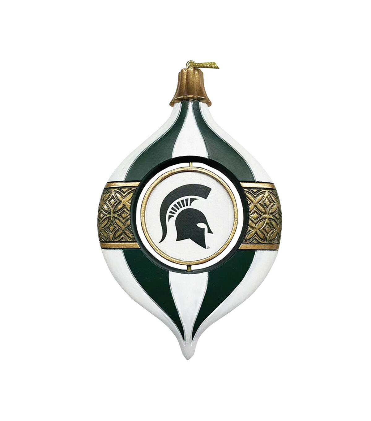 Show your team's logo and colors with this unique Spinning Bulb Ornament. These ornaments look great on a tree or hung anywhere. They also come in a plastic box to be stored year around. Make your sports season one to remember with this wonderfully handcrafted 5.5" Michigan State Spinning Bulb Ornament.