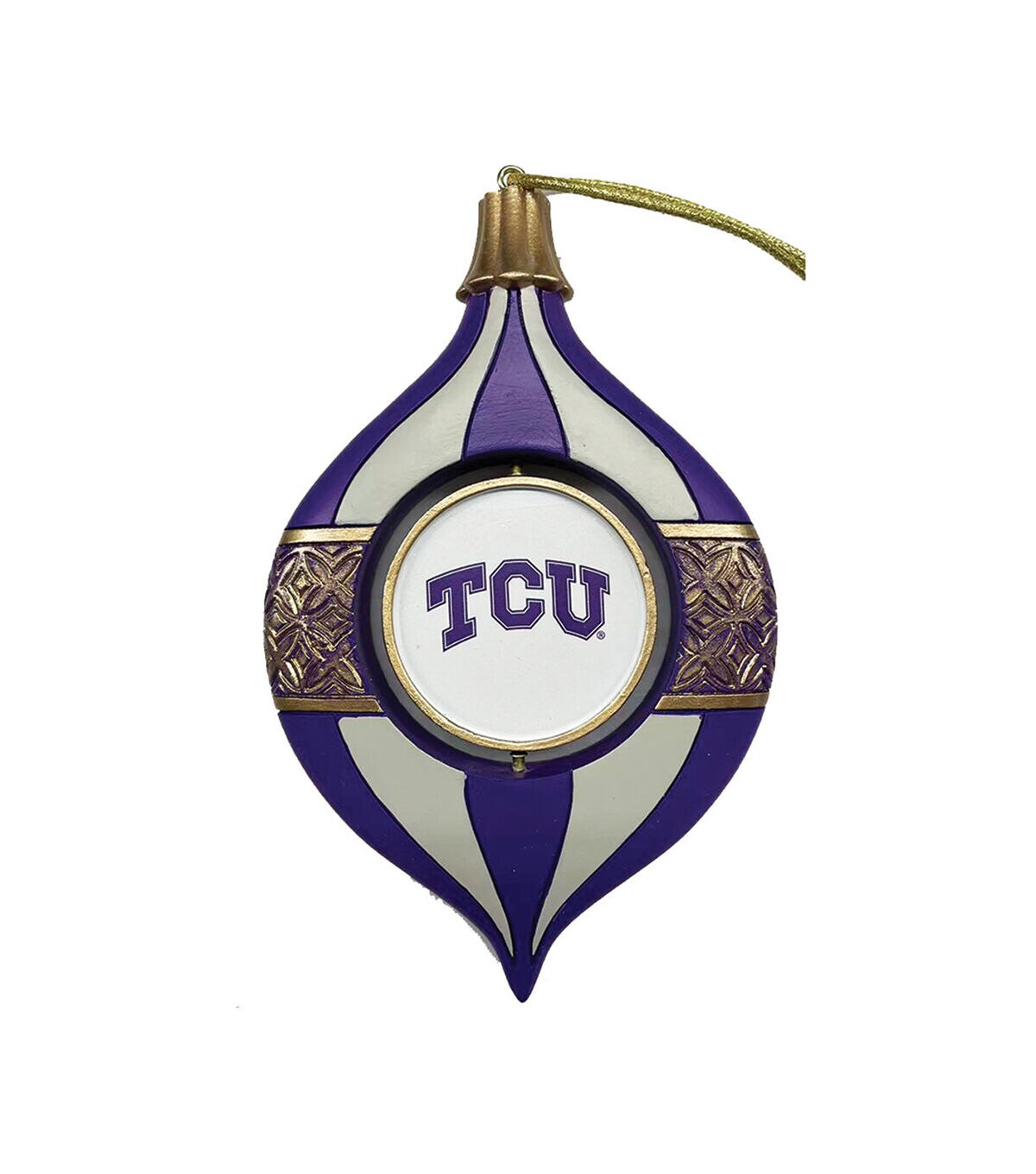 Show your team's logo and colors with this unique Spinning Bulb Ornament. These ornaments look great on a tree or hung anywhere. They also come in a plastic box to be stored year around. Make your sports season one to remember with this wonderfully handcrafted 5.5" TCU Spinning Bulb Ornament.