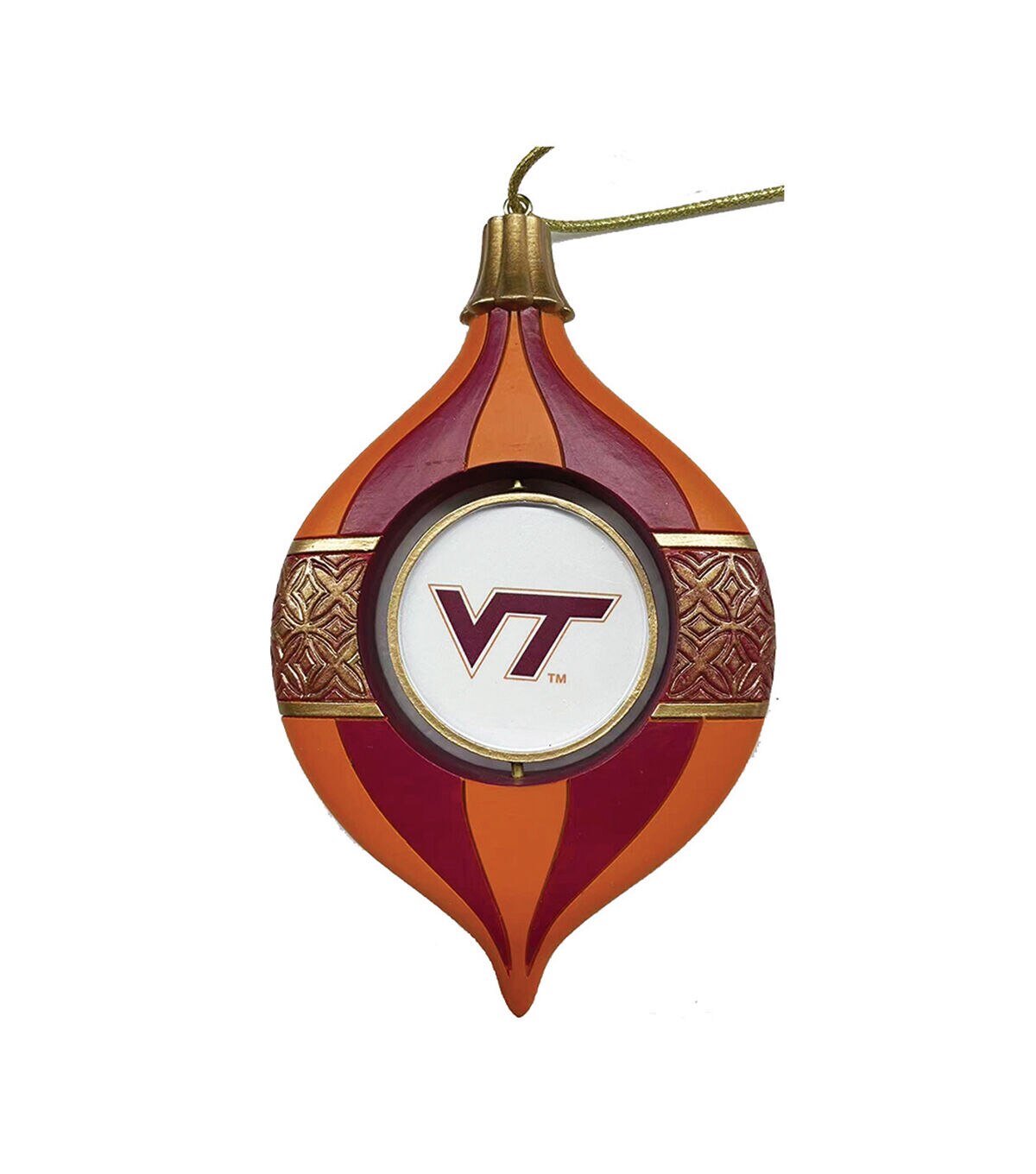 Show your team's logo and colors with this unique Spinning Bulb Ornament. These ornaments look great on a tree or hung anywhere. They also come in a plastic box to be stored year around. Make your sports season one to remember with this wonderfully handcrafted 5.5" Virginia Tech Spinning Bulb Ornament.