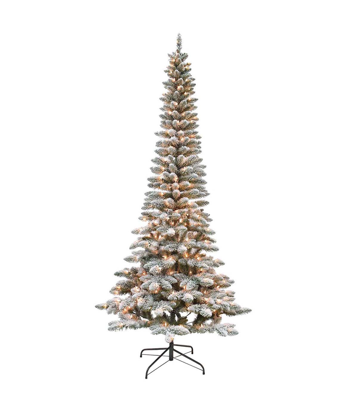 This heavily flocked pencil tree is ideal for any corner, foyer or tight space. The 7.5- feet hinged tree is lighted with 250 UL lights.