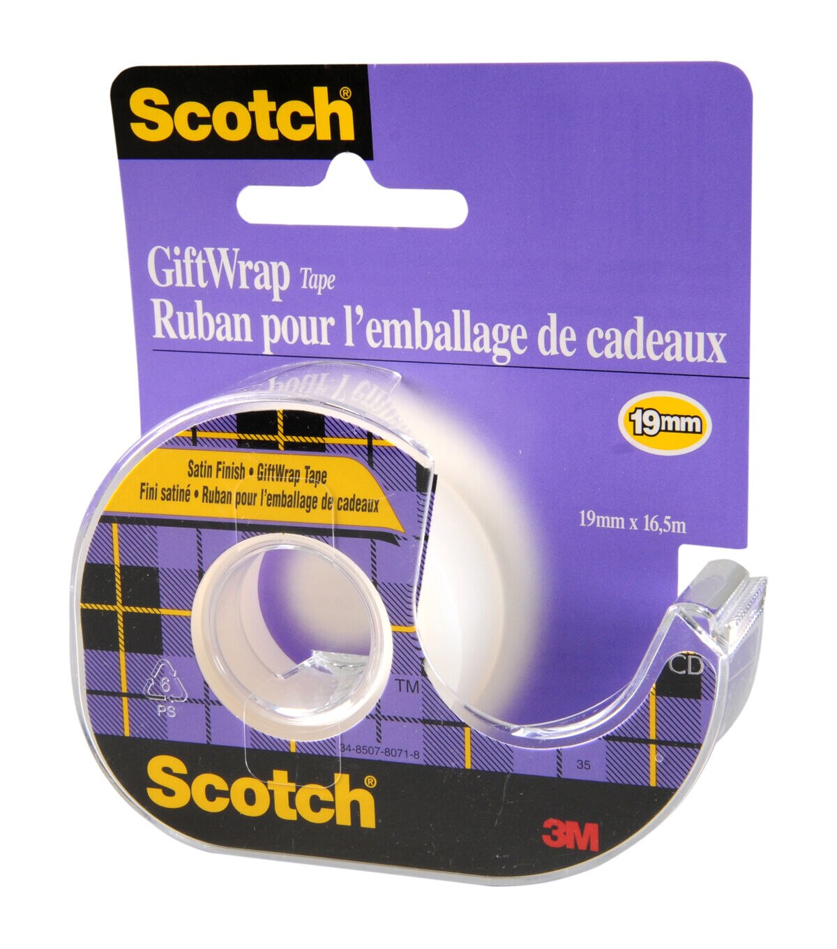 3M-Scotch Gift Tape Dispenser. This is great tape to have around the house during the holiday season or for working on paper craft projects. This package contains one dispenser with a 3/4x650 inch roll of tape. Made in USA.