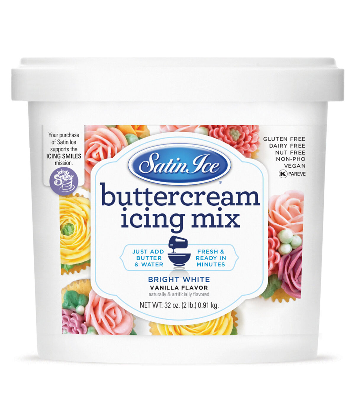 Satin Ice Buttercream Icing Mix is a soft dough-like base that mixes to a light, fluffy buttercream. Add real butter, a touch of water and mix for that authentic taste of homemade buttercream.. All in the fraction of the time. Forming a light delicate crust, while remaining soft on the inside, our buttercream can be used for covering and decorating, piping flowers and borders, string work, filling, crumb coat, and dessert base. Simply adjust the amount of water to suit your needs - firm, medium or soft. Add color & flavor to customize and express your creativity!