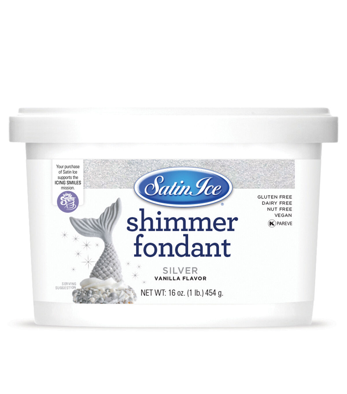 A first of its kind - the Satin Ice Silver Shimmer Fondant is premixed with 100% edible ultra-fine glitter. Add a touch of romance and elegance to your cakes, cupcakes and cookies without the extra time and materials. Classic satin finish with a beautifully radiant shimmer and delicious vanilla flavor that Satin Ice fondant is best known for. Mix with any of the Satin Ice fondant colors to create shimmer in any shade.