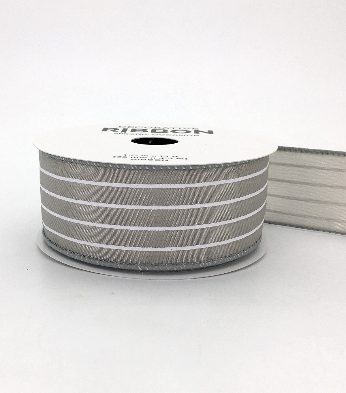 Use the Save the Date Ribbon-White Stripes on Light Gray to hang wreaths from windows, handrails, on doors and walls. Featuring stripes allover against a light gray background, this decorative ribbon is the perfect addition to your wedding decor. Turn it into a bow or flower embellishment to decorate your wrapped gifts.
