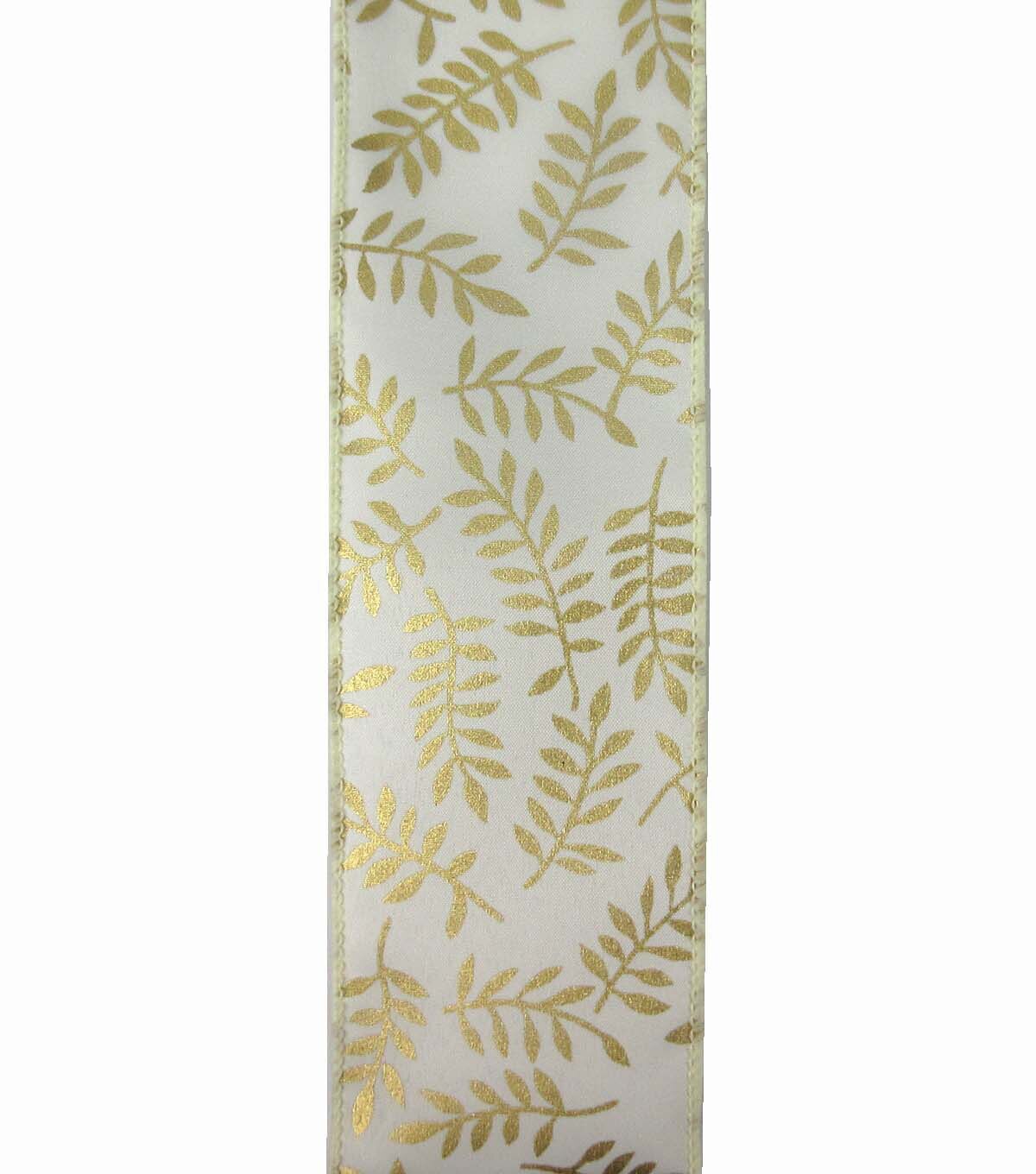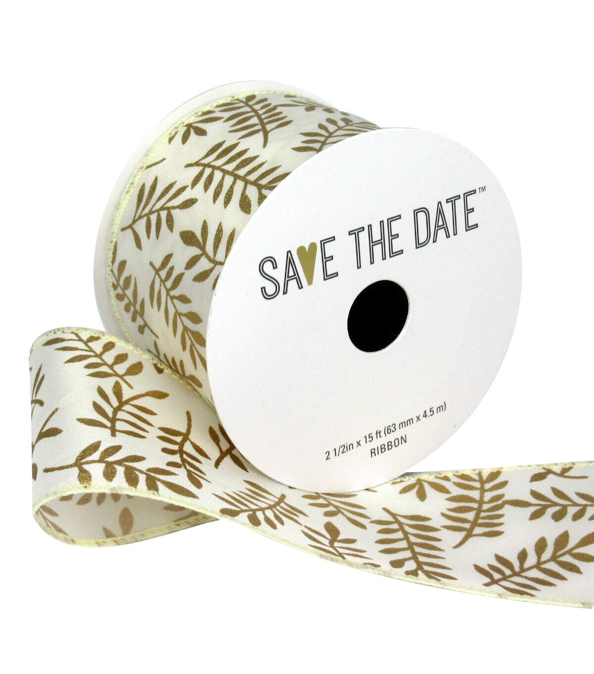 Add interest to seasonal floral arrangements, craft projects and DIY decor with the Save the Date Ribbon-Gold Ferns on Ivory. Team this decorative ribbon with other colorful ribbons, sold separately, to lend instant charm to a DIY wreath. Gold ferns against an ivory background will instill elegance into any decor.