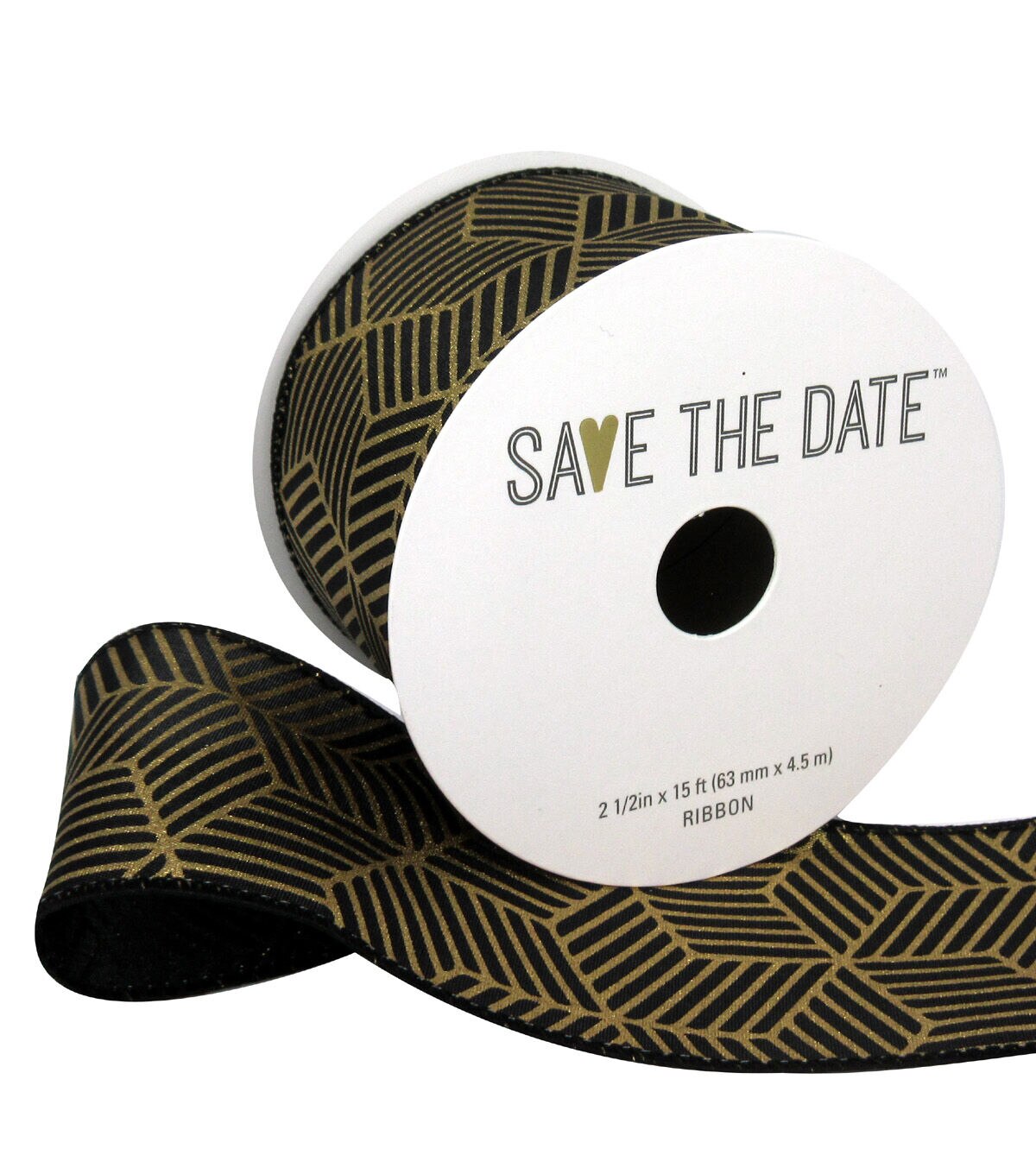 The Save the Date Ribbon-Gold Geometrics on Black lends visual flair to any wedding centerpiece or display. Cut, twist, curl and tie it as you please to create your own ribbon crafts at home. The black decorative ribbon is embellished with a gold geometric pattern.