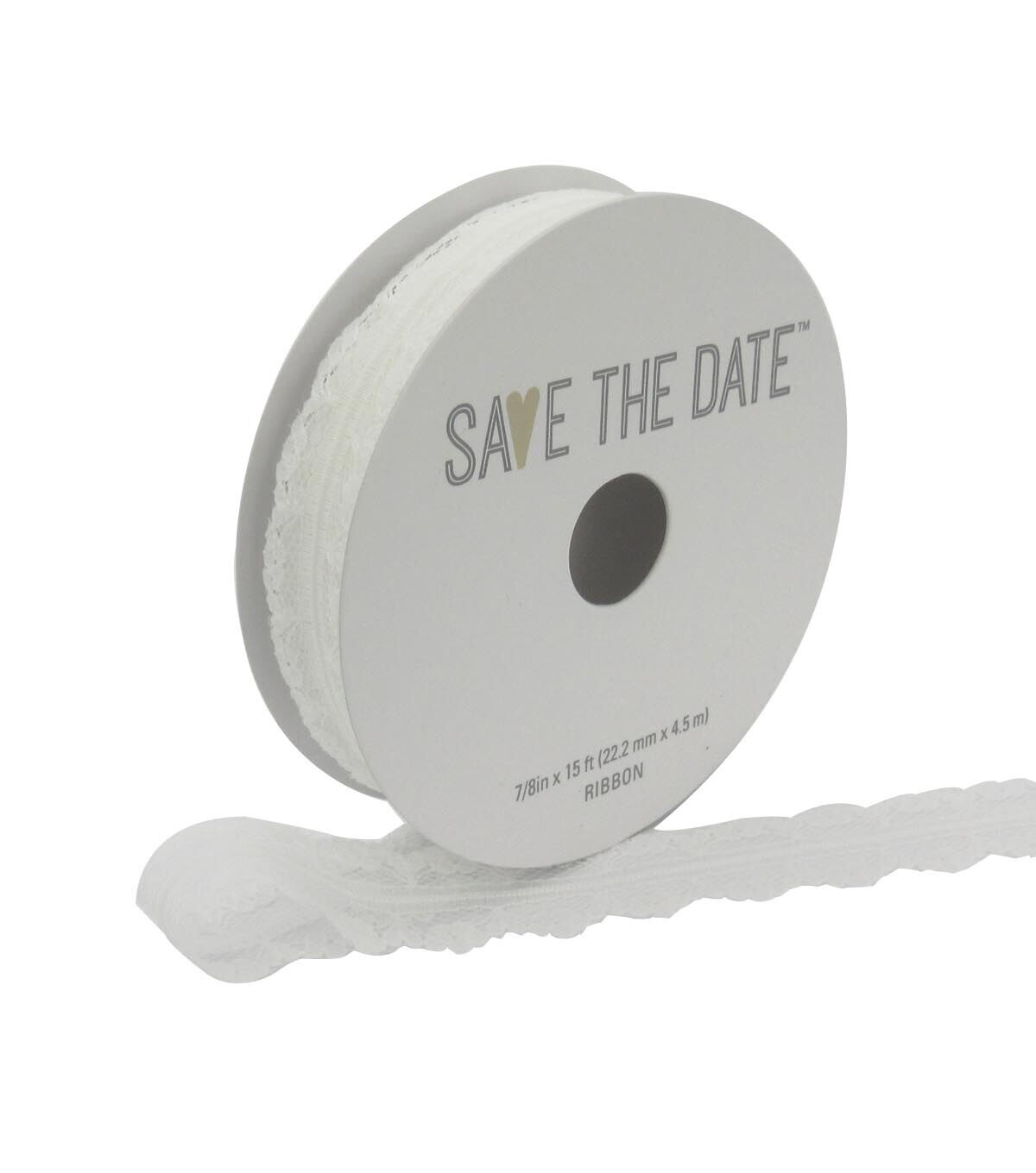 Embellish your wedding decorations by accenting wreaths, garlands, table settings, mantel decorations and more with the Save the Date Lace Ribbon-White. It features a white background that adds charm and elegance to any setup. Team it with other contrasting ribbons, sold separately, to create an appealing decor.