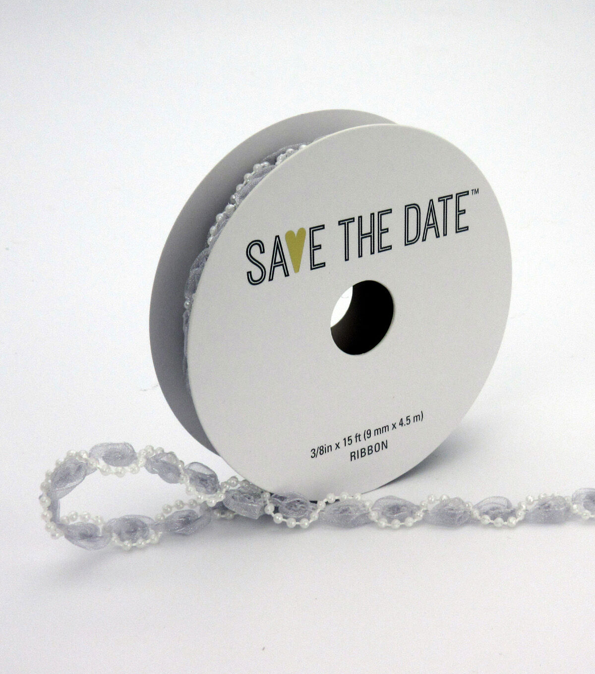 The Save the Date Ribbon-Light Gray Wrapped with Pearls makes the perfect choice for your wedding decor. Featuring a flowery shape with pearls attached to it, this ribbon will give a charming touch to any decor. You can drape it around a garland teamed with baubles, faux flowers and pinecones to create an elaborate look.