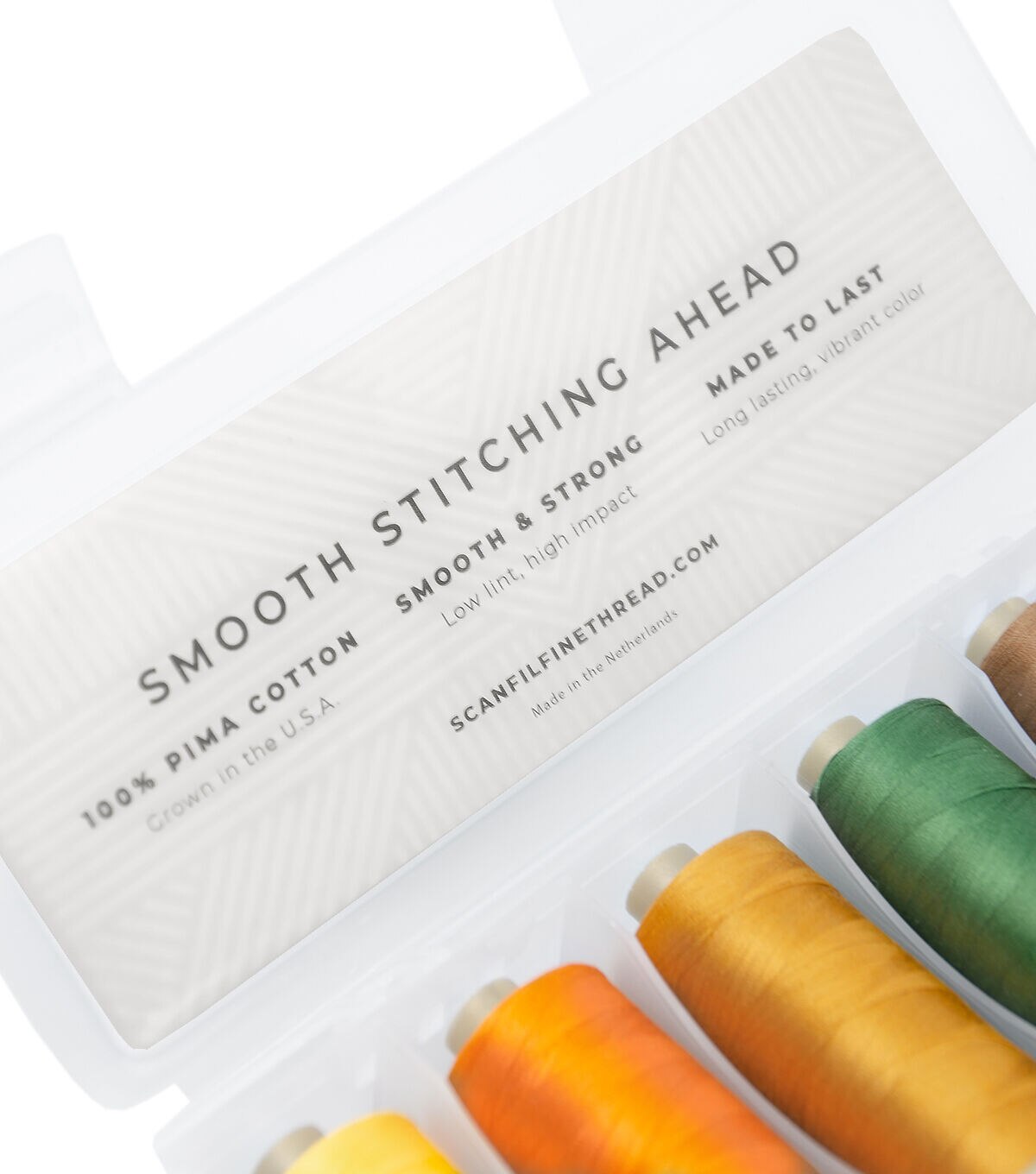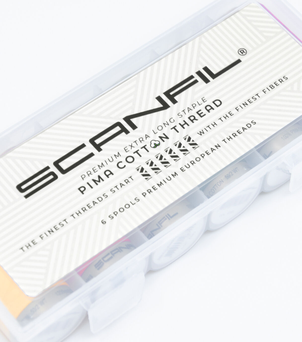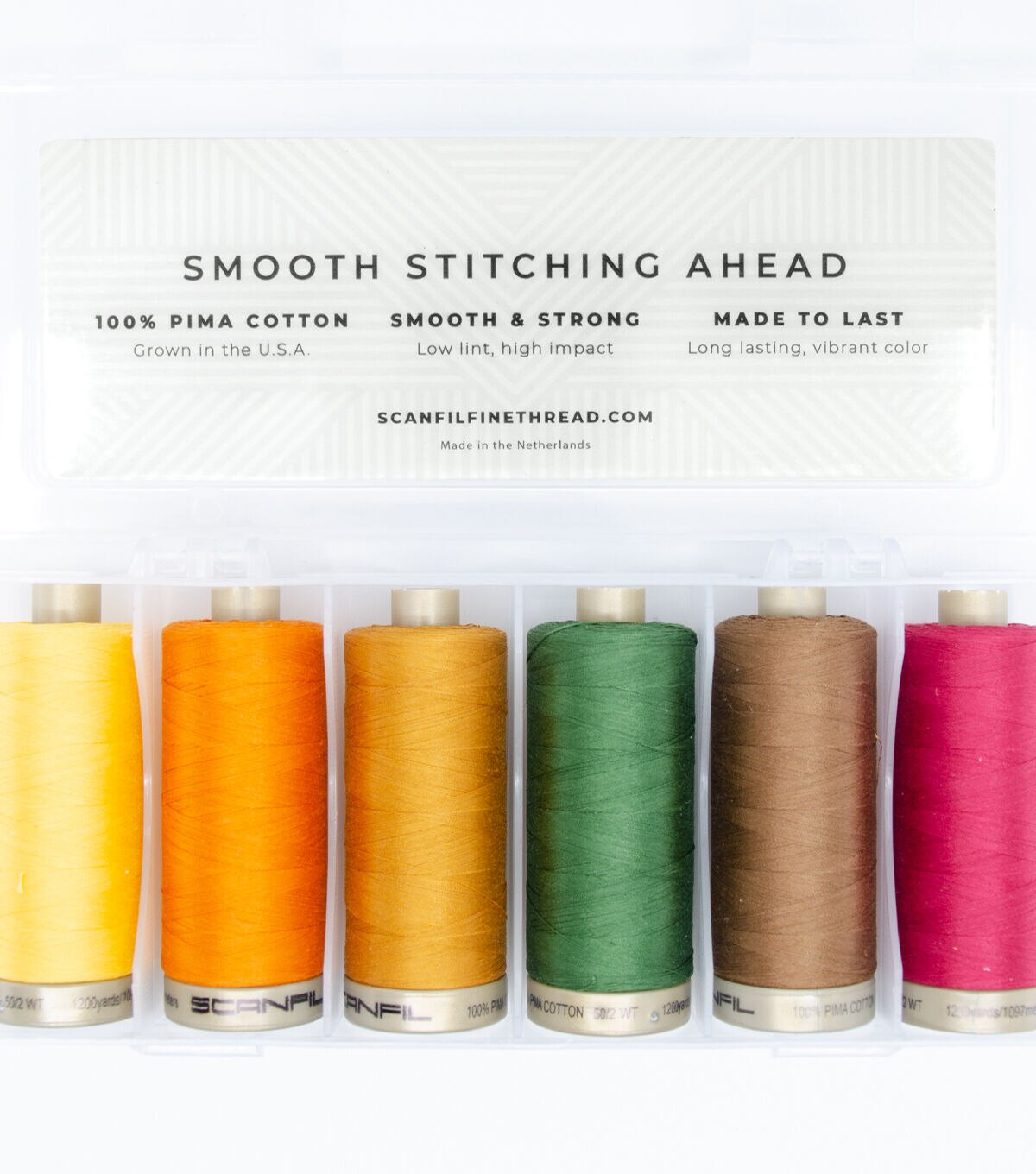 - SET OF 6 + STORAGE BOX: This 6-Pack features 6 spools each wound with 1200 yards of premium Pima 50 weight cotton, the preferred quality for quilting and sewing, plus a reusable storage box with 6 compartment for organizing small items.