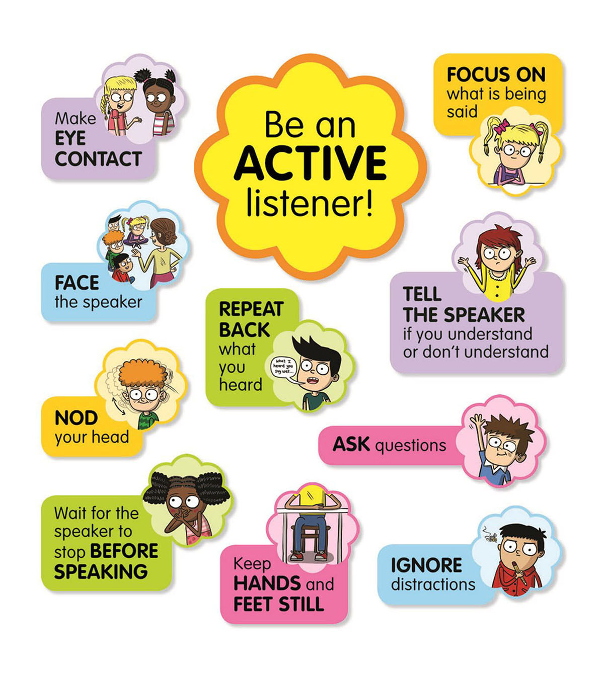 Improve communication in the classroom by encouraging students to develop their active listening skills. Illustrated cards feature 10 actions students can take to become better listeners. Pair with the Conversation Starters bulletin board set to build speaking and listening skills and keep the conversation flowing. Includes 11 pieces: • Be an Active Listener banner (16" diameter) • 10 active listening cards • Teaching guide