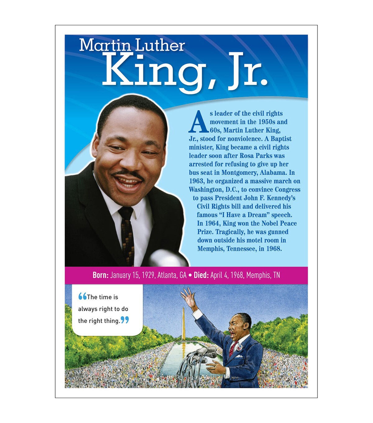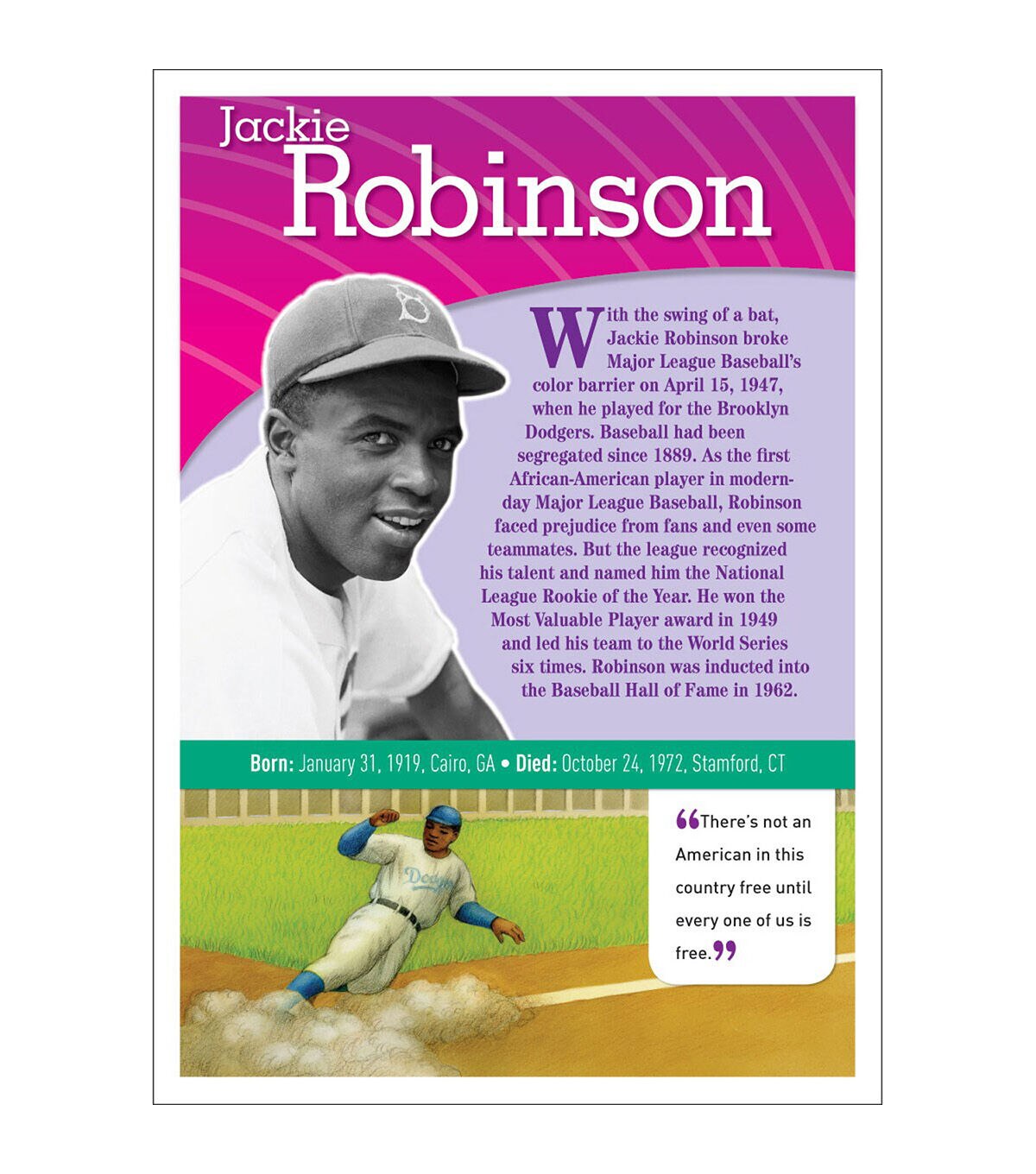 - Each mini-poster includes a large photograph, a full-color illustration, a brief biography, and a quotation from each person.