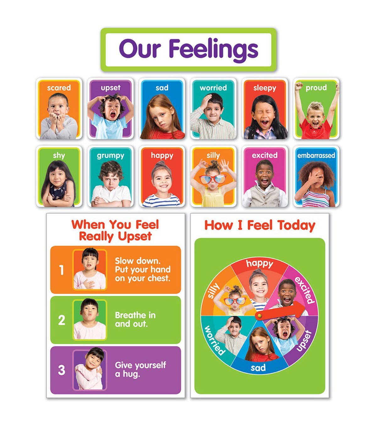 Help young children build social-emotional skills with the Our Feelings bulletin board set. Twelve emotion cards feature real photos of children. The How I Feel Today spinner helps children identify their feelings. Also includes a poster to help children calm down when they feel upset.