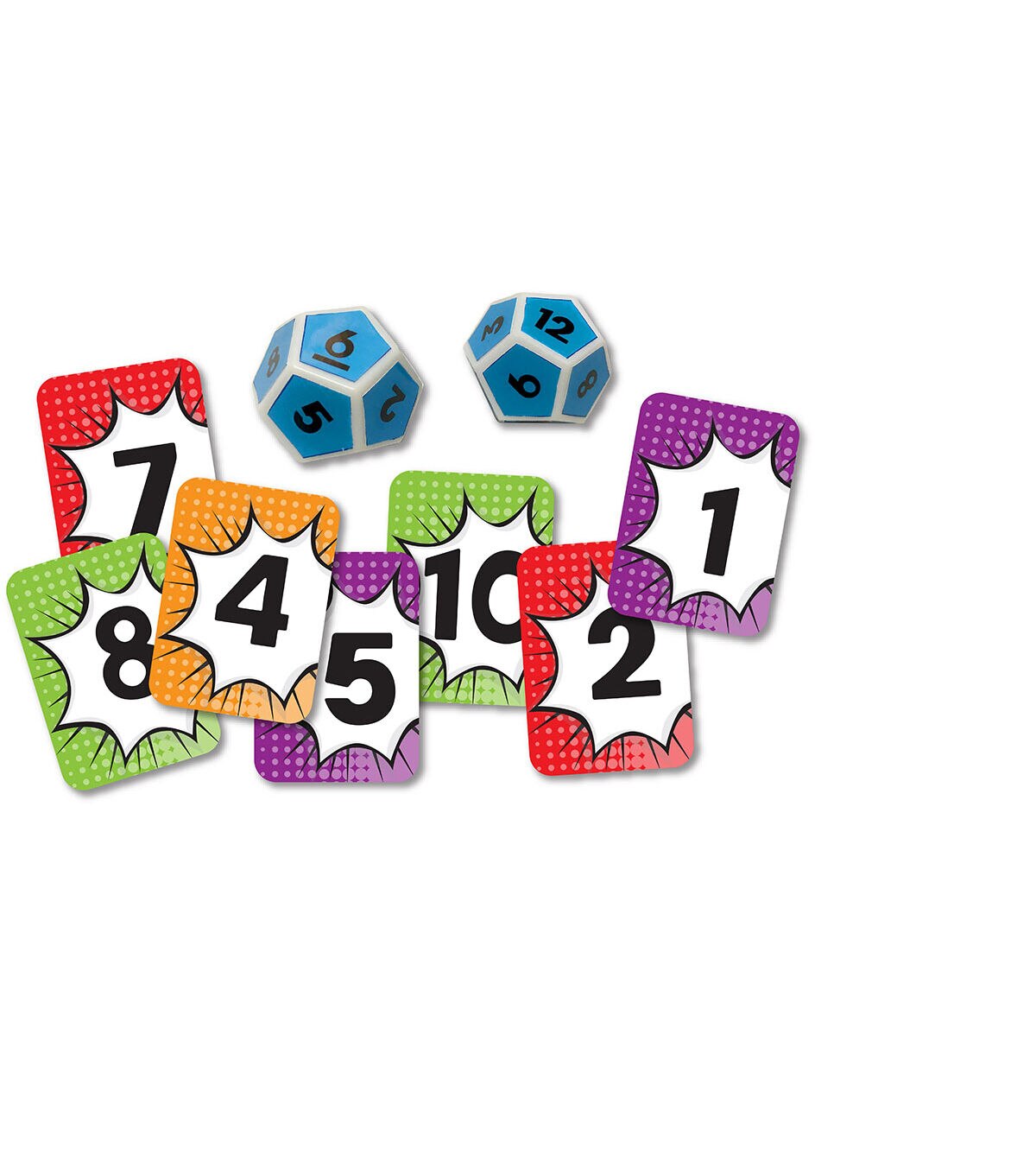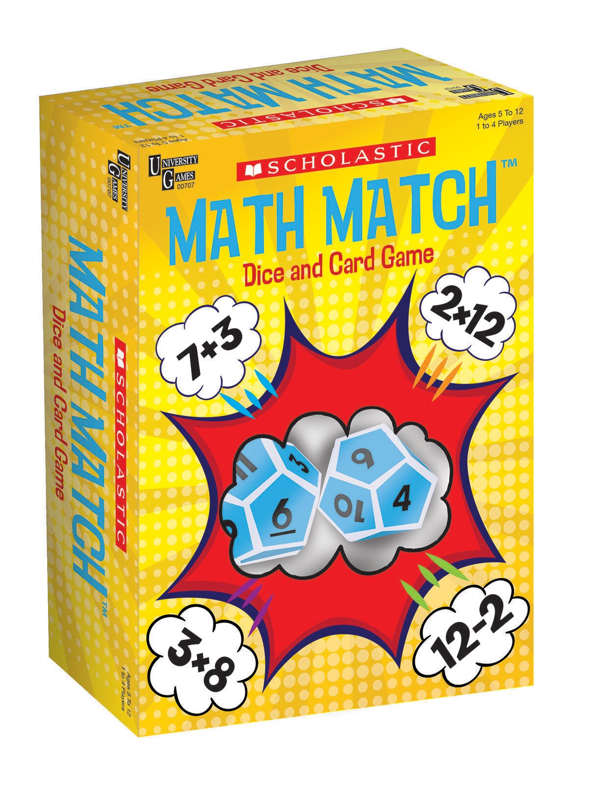 Fun earning game built around core math skills. Players add, subtract, multiply or divide score cards to get the closest Math Match to the target dice. Includes 2 12-soded dice and card deck. Ages 5+