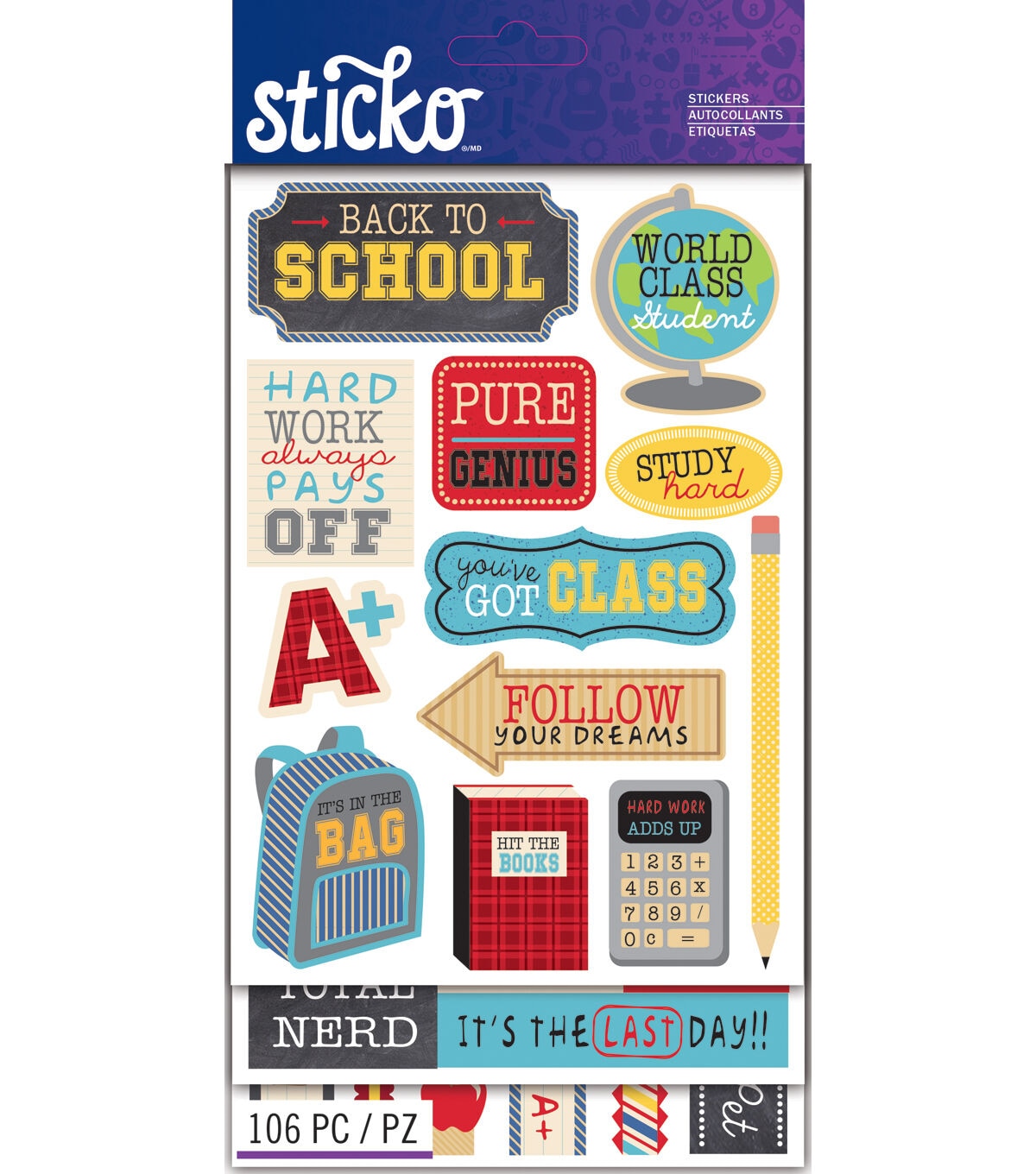 This Sticko - School Flip Pack of stickers has everything you need for your craft or DIY project! Icons, phrases, alphabet and border stickers all coordinated and ready to go on cards, layouts, binders or just about anywhere.