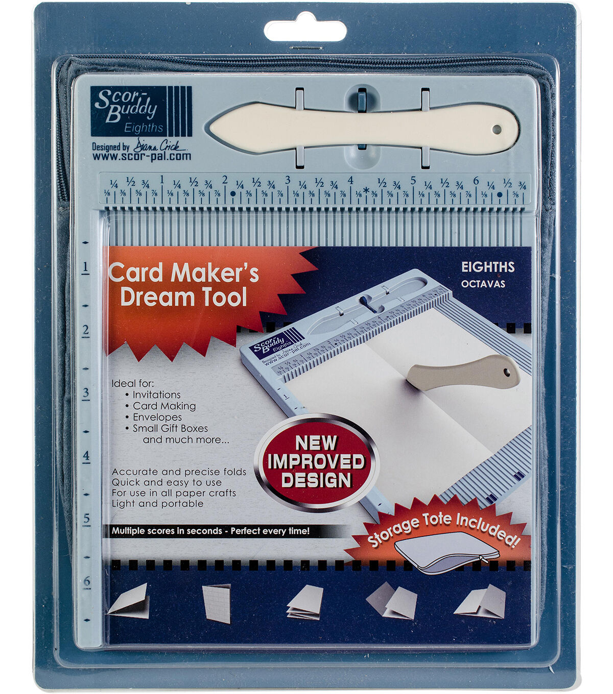 One of the key benefits of Scor-Buddy is the ability to score multiple score lines at the same time, without moving the cardstock. Make intricate cards, grid and reverse grid cards, gate fold cards, accordion folds, brochure/flyer score lines, boxes, origami, iris folding's and more! This package contains one 9-1/4x7-3/8 inch Scor-Buddy mini scoring board with centimeter measurements on both sides (up to 17 centimeters) and markings for scoring specific paper folds, one scoring tool and one storage tote. Imported.