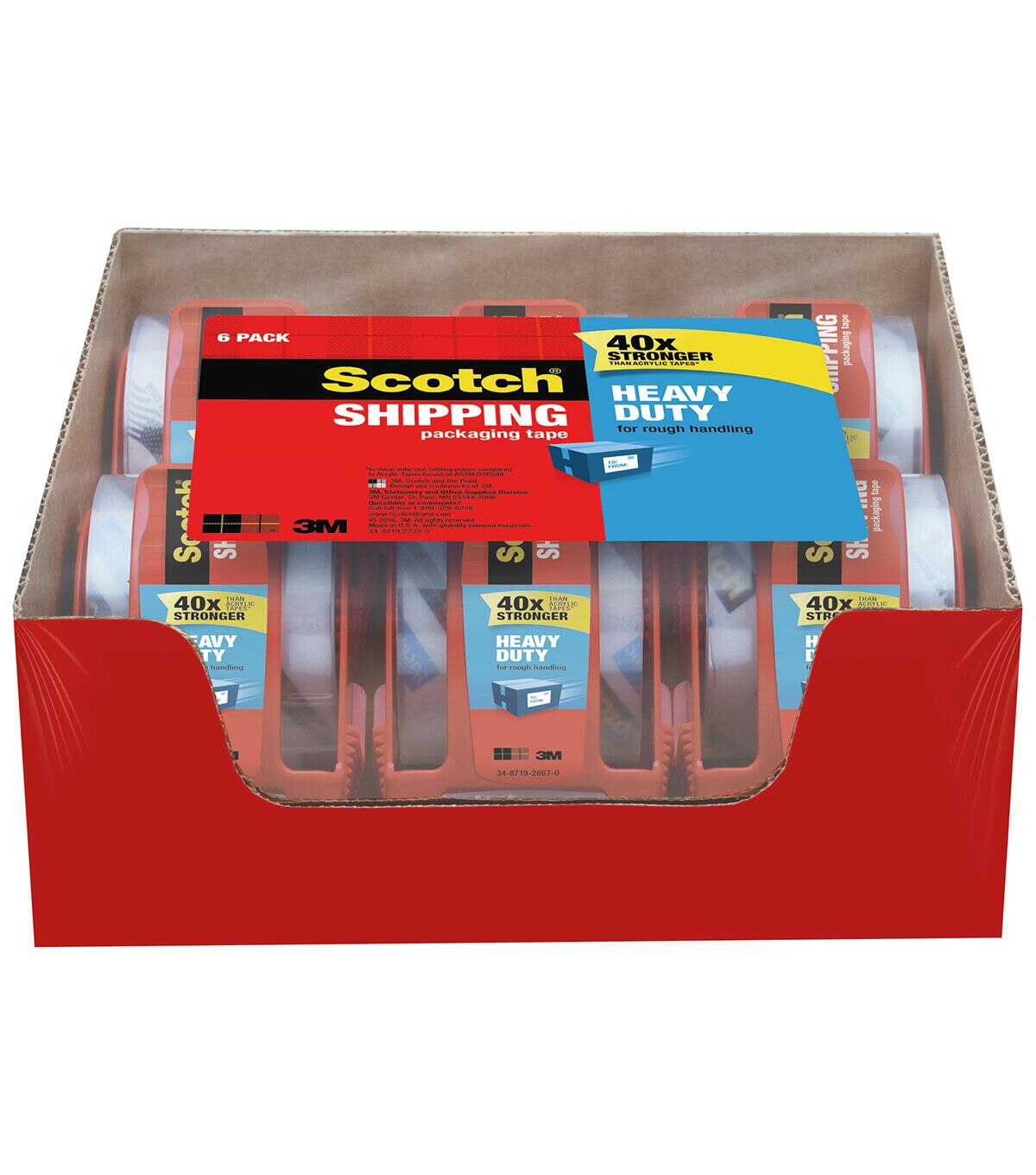 Scotch Heavy Duty Shipping Packaging Tape. 40X Stronger than acrylic tapes. Our strongest packaging tape that is ideal for shipping heavy packages. Meets US Postal Regulations for standard packages. Each roll of tape measures 1.88" x 800". Includes 6 rolls of tape, each with a dispenser.