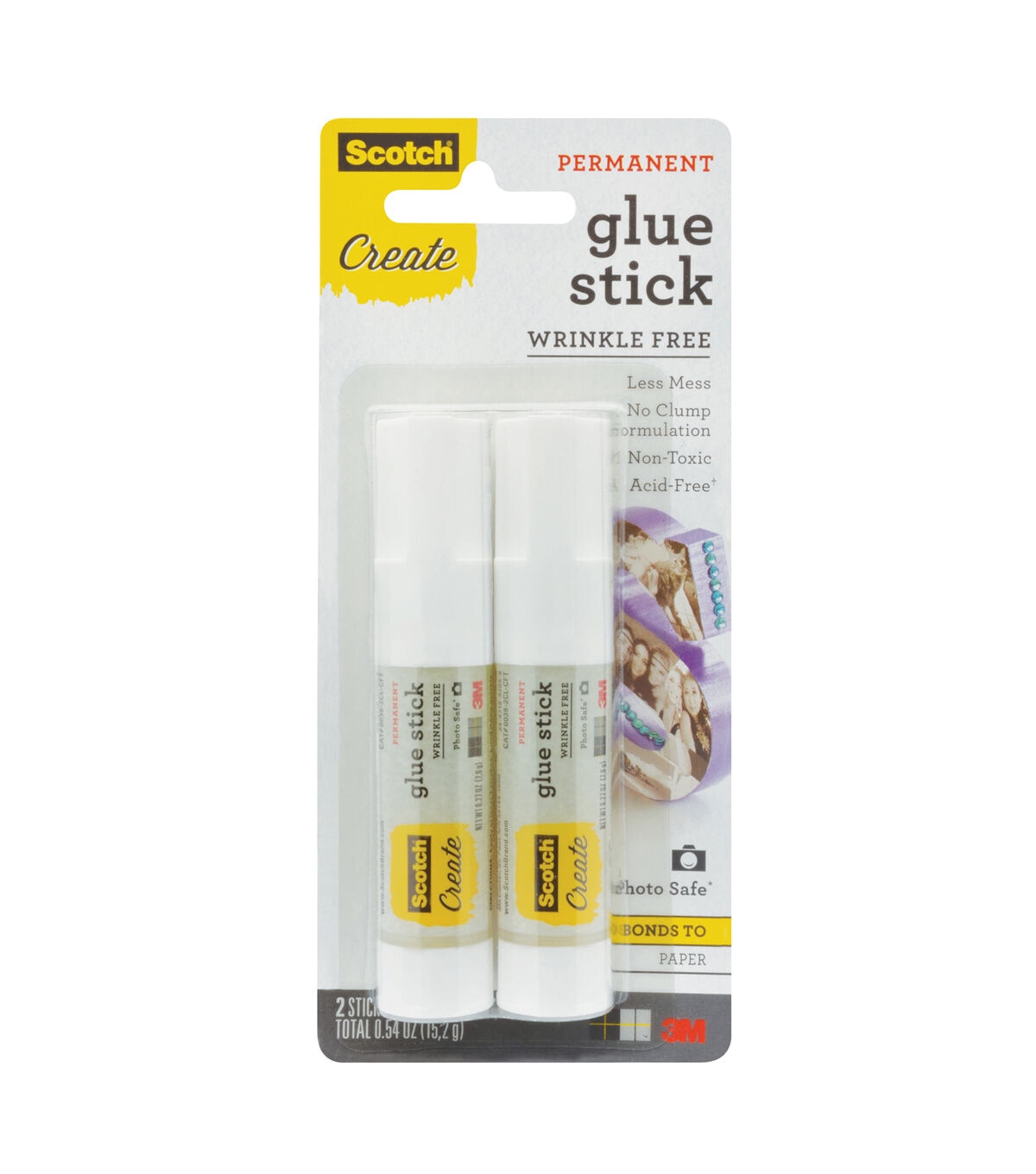 Perfect for kids' school projects, the Scotch Create Wrinkle Free Permanent Glue Sticks-Clear can be used on scrapbooks, cardboards, papers, envelopes and photos. The pack contains two clear glue sticks that prevent clumping and wrinkling on most papers. It's acid free and nontoxic, making it ideal for classroom and office use.