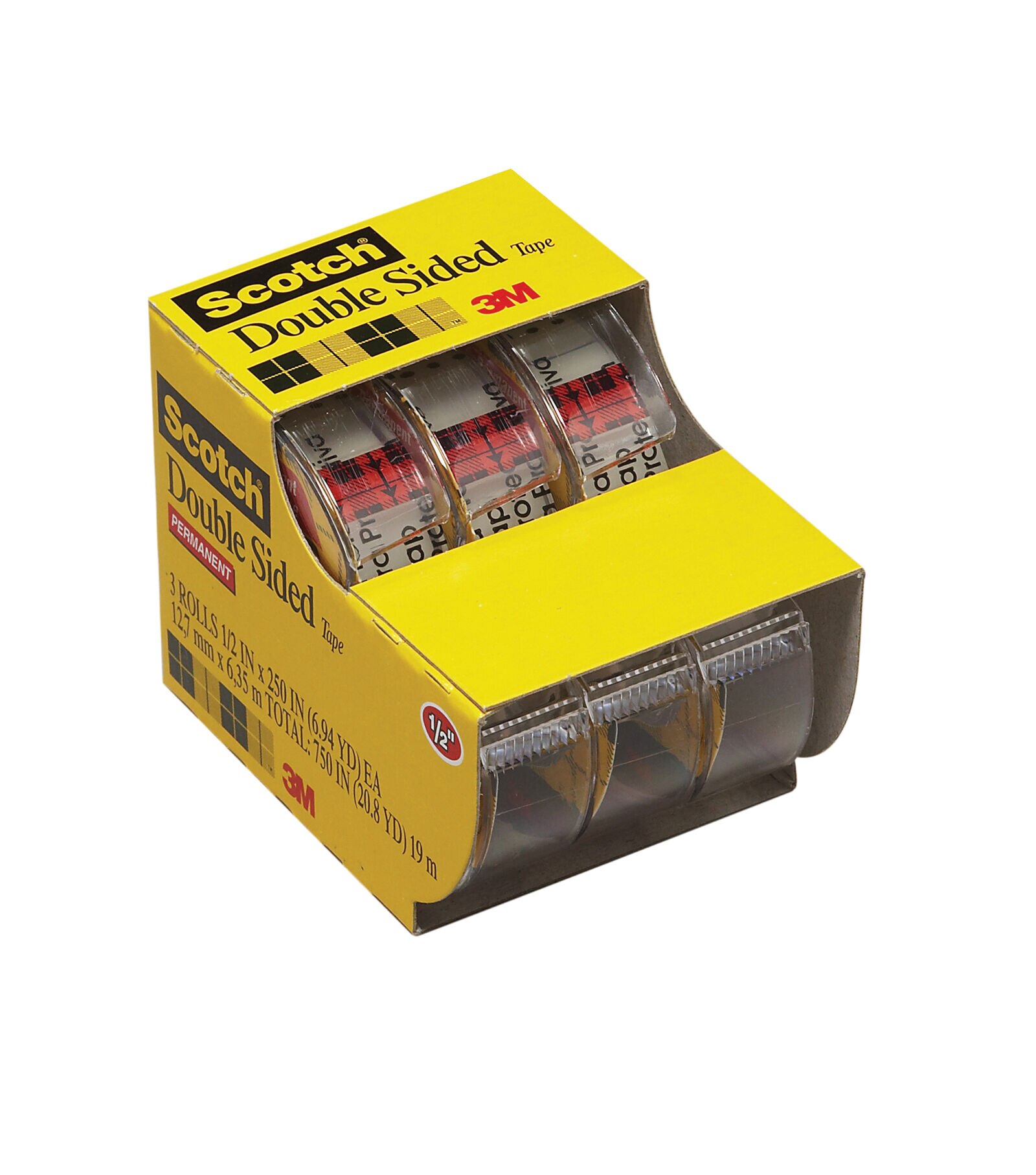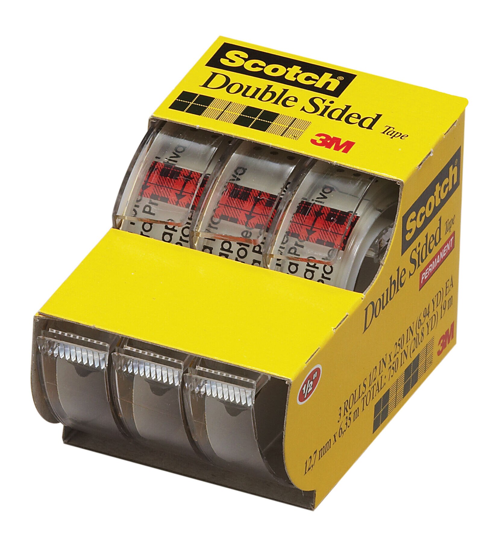 3M-Scotch Double Sided Tape. This permanent double-sided tape is coated with photo-safe permanent adhesive on both sides. This tape is definitely a no-mess alternative to glue for light-duty attaching and mounting tasks. This package contains three disposable dispensers containing 1/2in x 250in rolls. Photo-safe determined in accordance with ISO standard 18916. Contents conform to ASTM D4236. Made in USA.