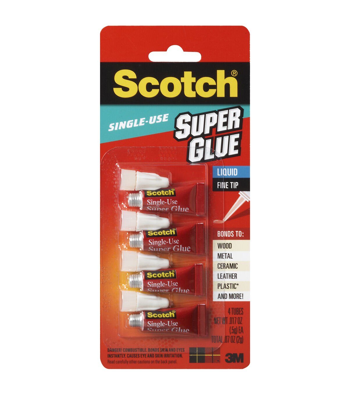 3M-Scotch Super Glue Gel. A fast drying; strong adhesive designed for a wide variety of porous and non-porous surfaces. It is excellent for wood; metal; rubber; vinyl; leather; ceramics; plastics and more. This package contains four .017oz one time use tubes of super glue gel. Conforms to ASTM D 4236. Imported.