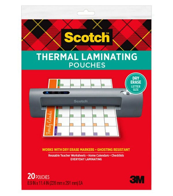 Scotch Thermal Dry Erase Laminating Pouches protect documents that you use frequently. Protects and adds professionalism to business documents. Great for signs, flyers, schedules, certificates, to-do lists, and other frequently used documents. Ultra clear to let important information show through and resists ghosting for reuse with Dry Erase markers. Ideal for marker-proof, tear-proof and spill-proof paper items that you want to last in the home, office or classroom. Recommended to use with Scotch Thermal Laminators. Letter Size, for items up to 8.9 in. x 11.4 in. 20/pack.