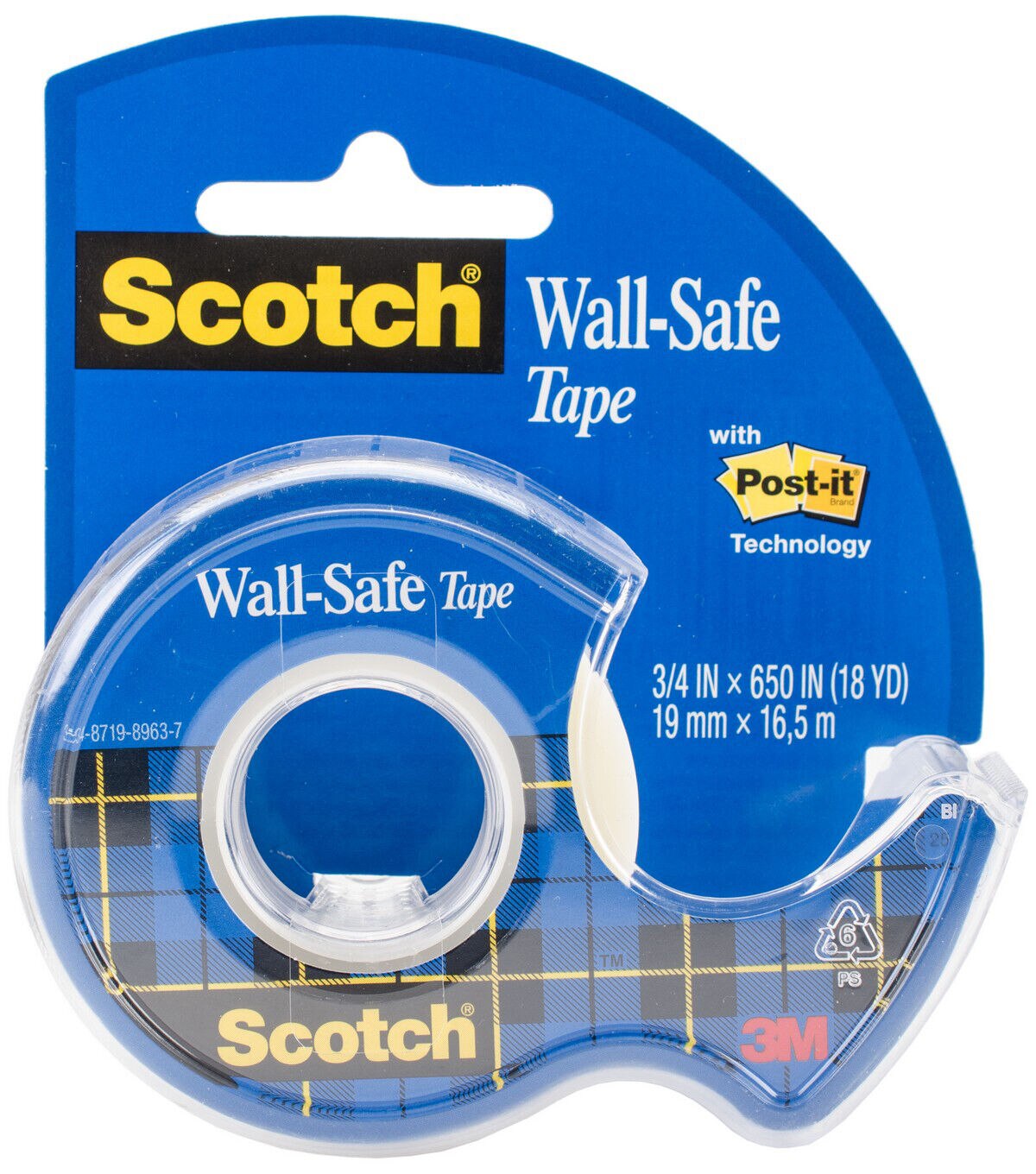 Wall-safe tape removes cleanly from wall and other home and office surfaces. Safe for painted drywall, stainless steel, tile, wood, mirrors and windows. Great for lightweight items, decorations and temporary posting of papers. Package contains one 3.75x2.5x1 inch tape dispenser with 18 yards of .75 inch tape. Made in USA.