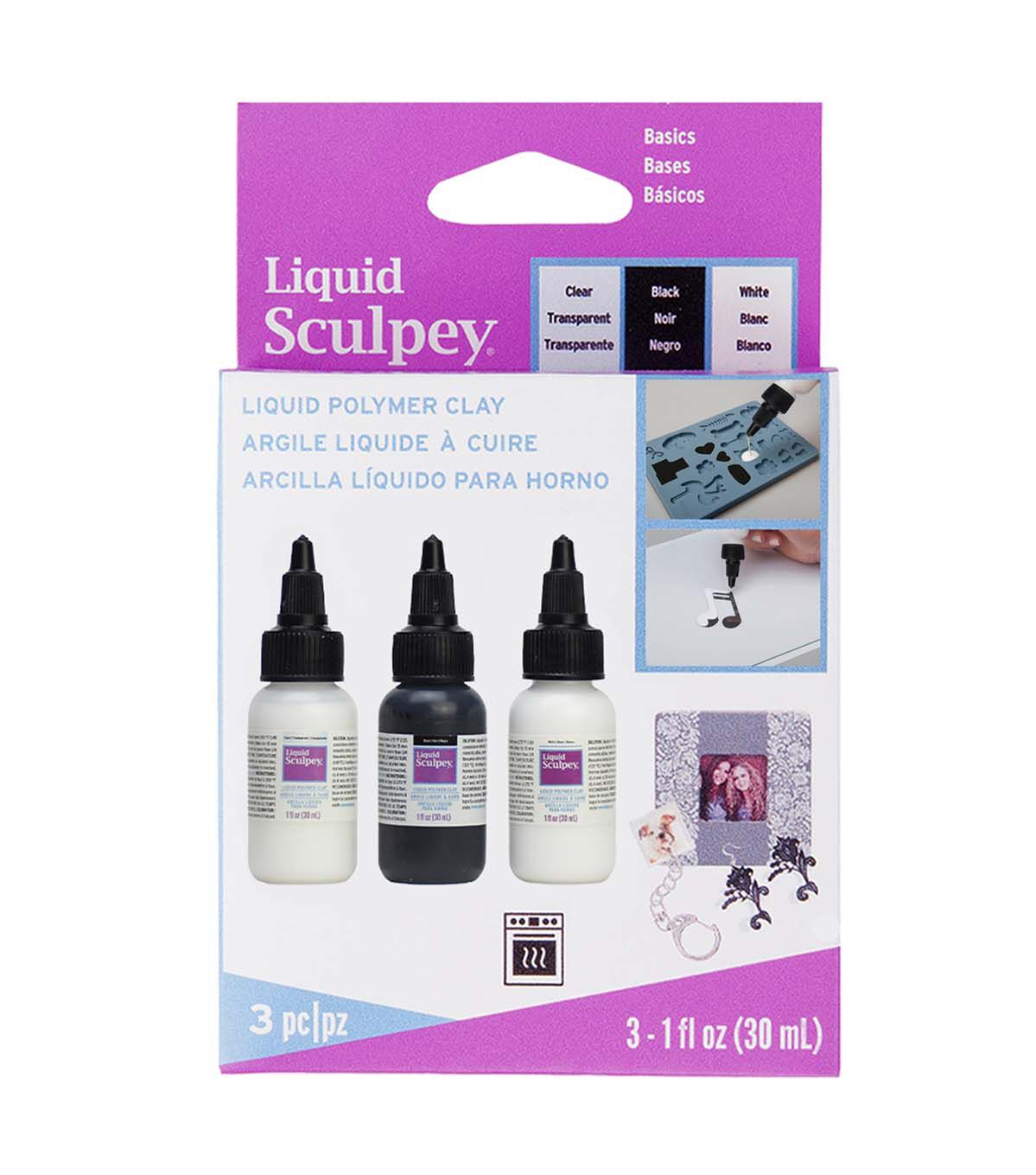 The Sculpey Liquid Polymer Clay-Basics includes a translucent liquid form of polymer clay in plastic squeeze bottles. This liquid bakeable medium is a versatile product that can be used in oven-safe silicone molds, to embellish clay, used as a grout, window clings and so much more. After baking, it is semi-translucent, not white. Pour into molds, paint, or dribble onto raw or baked Sculpey. Mix with powdered pigments or oil-based paints to create your own colors, washes and swirls. Great for creating image transfers and stained glass effects. This pack contains three 1-fluid ounce bottles of Liquid Sculpey in clear, black and white.