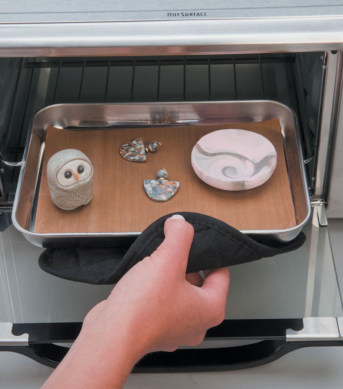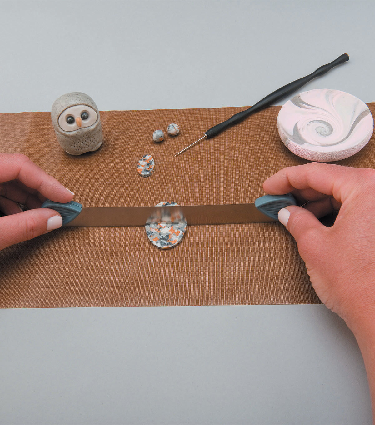 Polyform-Sculpey Work N Bake Clay Mat. A safe mat that helps keep your countertop clean. It allows users to bake their clay right on the mat. This mat is non-skid and is made of Teflon and silicone. This package contains one 7-3/4x13 inch work n bake clay mat. Imported.