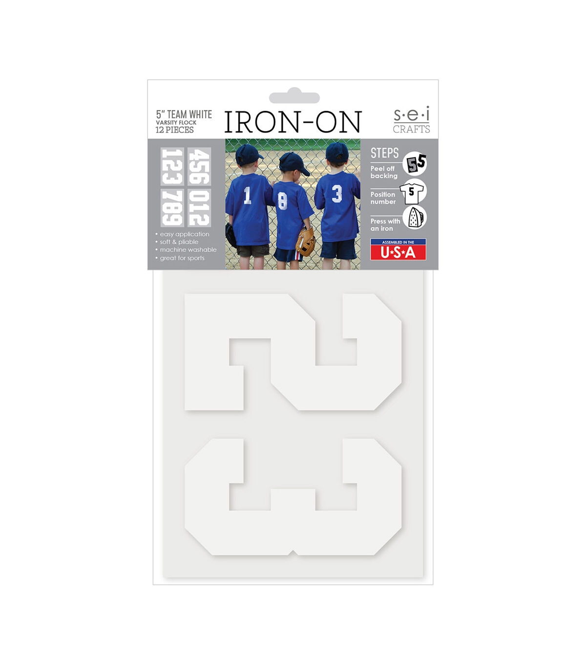 Personalize & Decorate! These 5 inch tall iron-on white numbers have a soft flocked (fuzzy) surface. They are easy to apply, machine washable, and very durable. Simply iron onto a heat-resistant material like T-shirts, sweatshirts, jerseys, uniforms, bags etc. For best results, prewash garment before applying. Care instructions: machine wash cold and let air dry. Assembled in USA