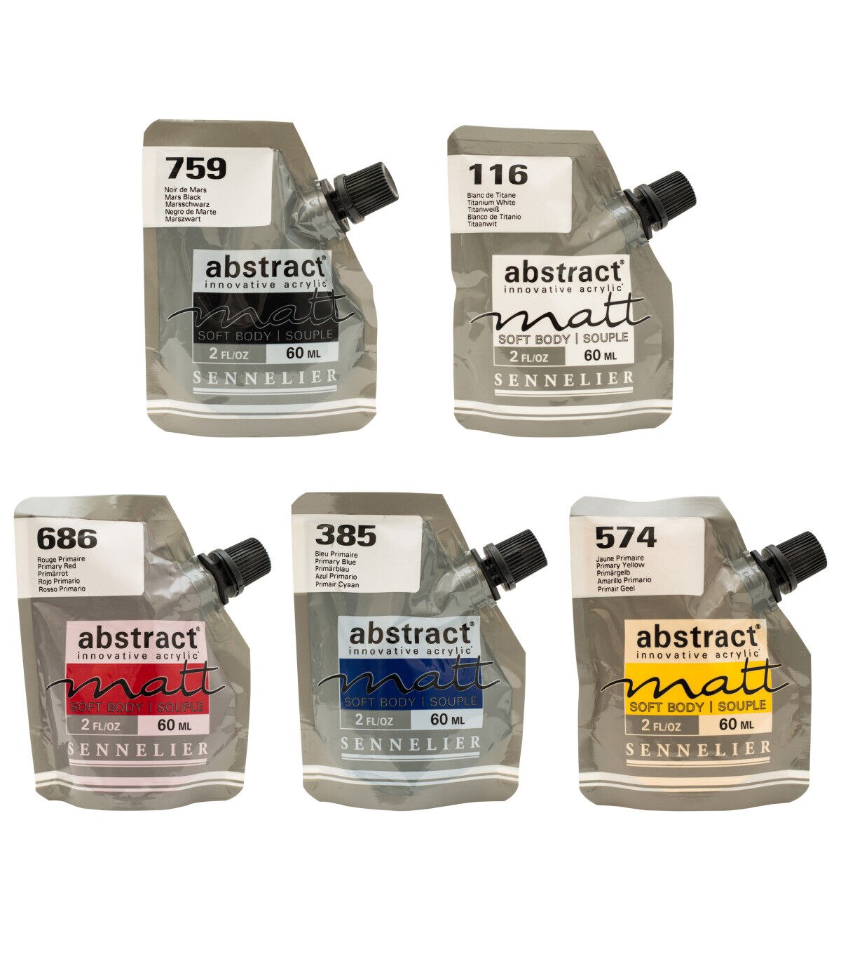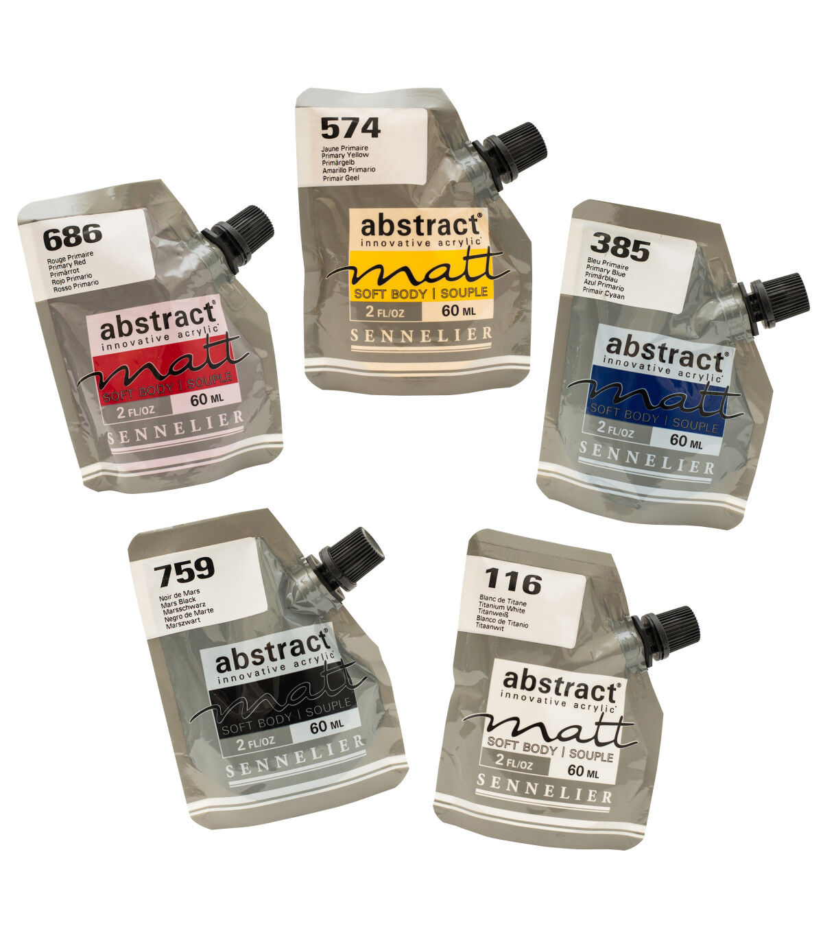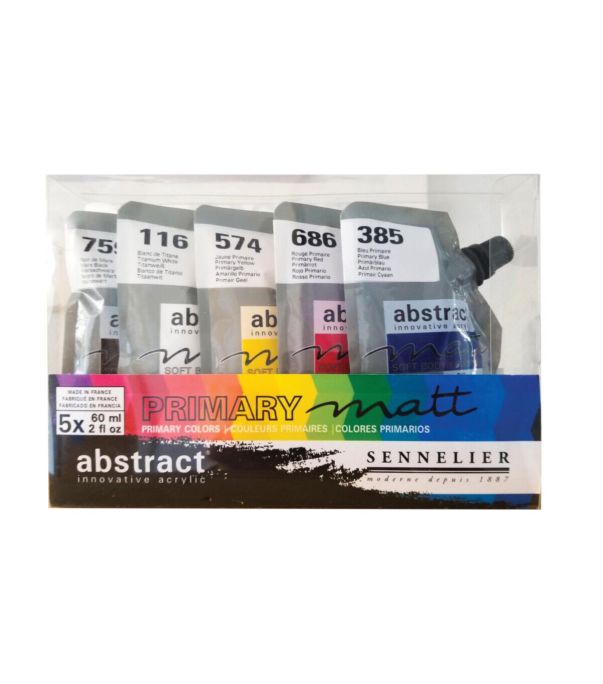 Highly pigmented, heavy body acrylic paints in an innovative flexible pouch! These fine quality paints come housed in an extra-sturdy, easy-to-transport squeezable pouch that features a transparent window that shows the exact color inside. Paint straight out of the pouch or use it as you would any acrylic paint. Set contains 5 primary colors.