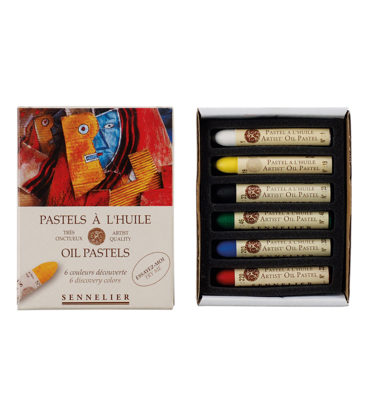 Created in the 1940's in collaboration with Picasso, these creamy, lipstick-like pastels are rich in pigment, cover well and have outstanding opacity and lightfastness. They may be thinned with turpentine and worked with a brush, are acid-free and can be applied to any surface. The set includes 6 color pastels.